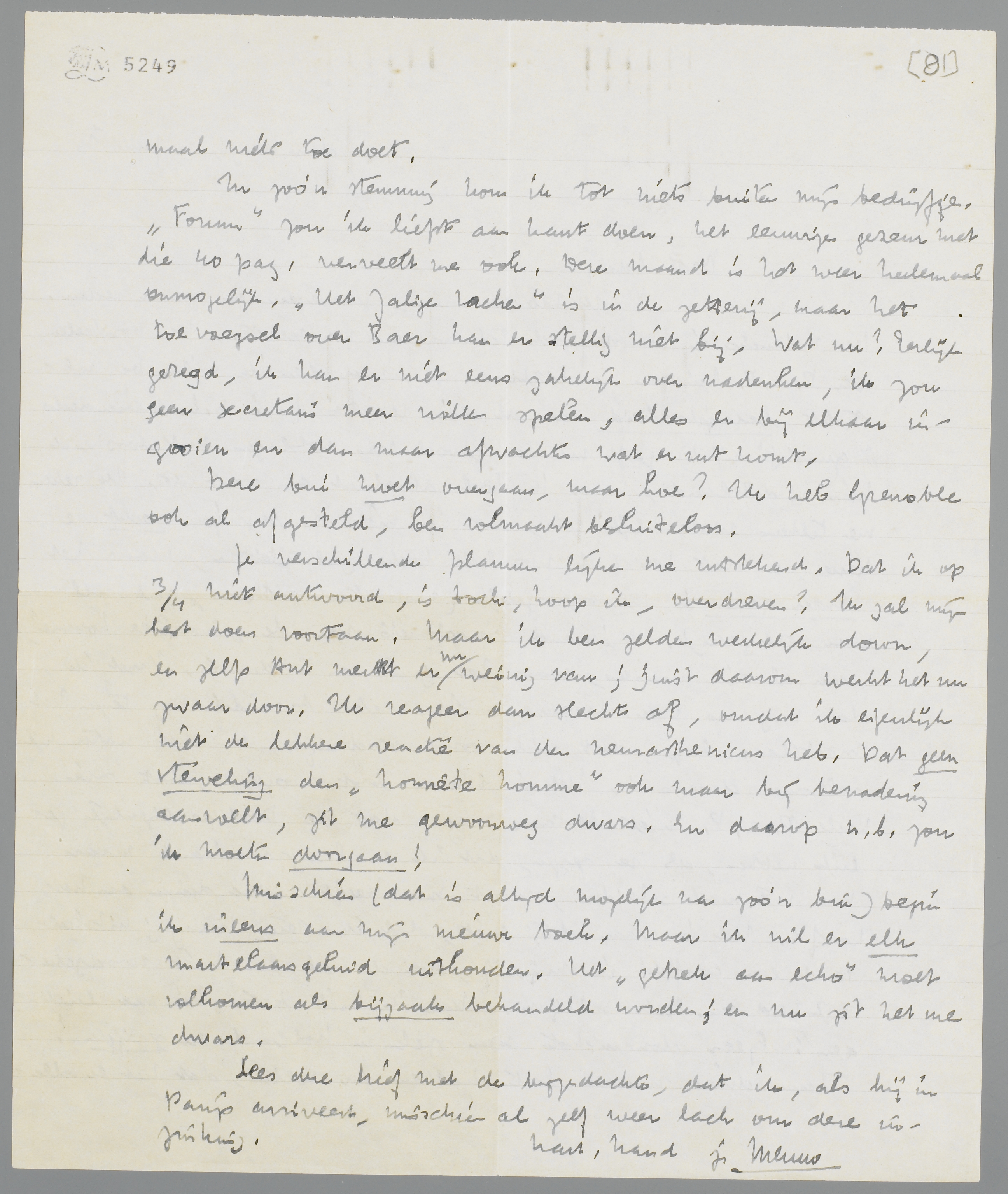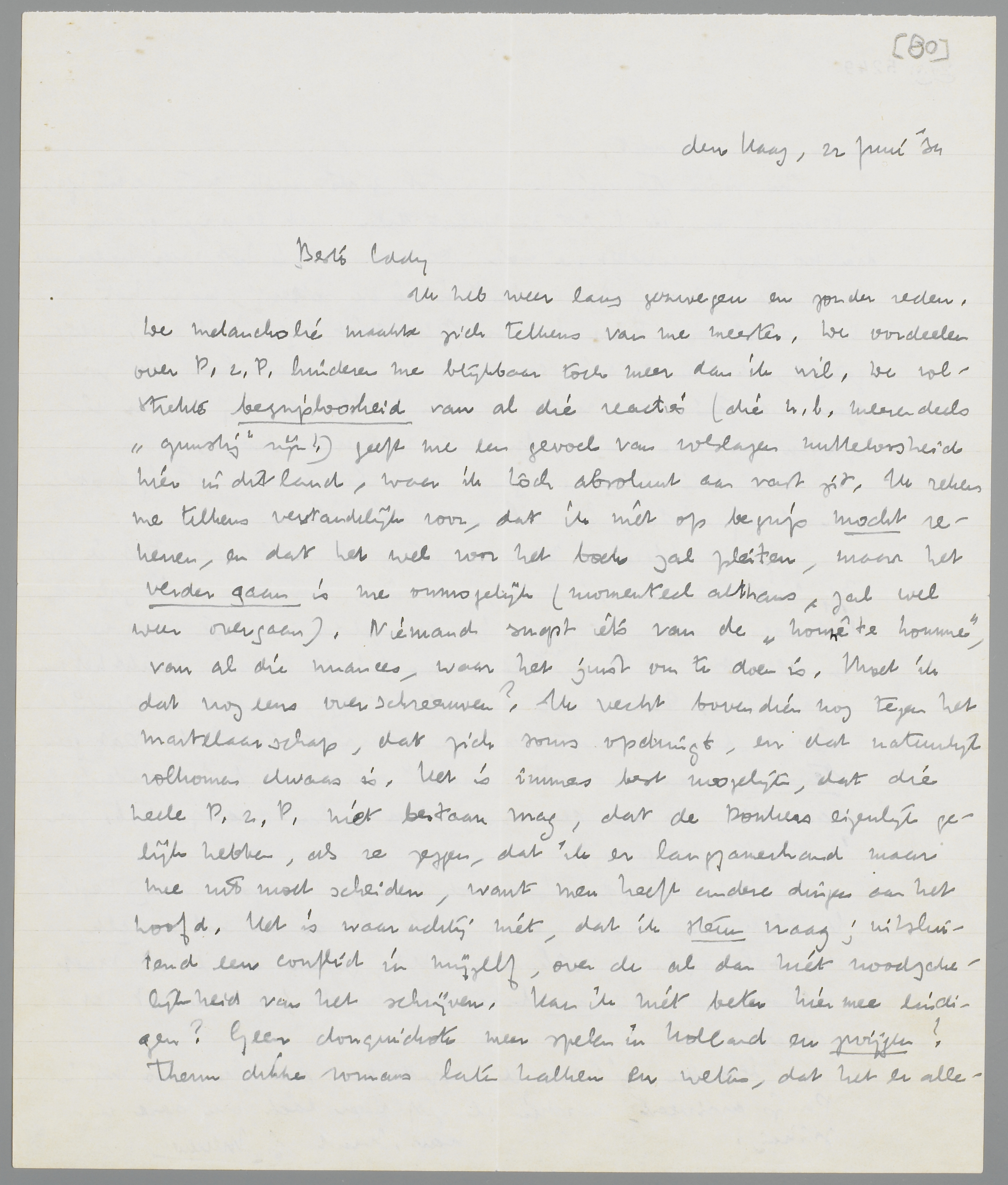 Je verschillende plannen lijken me uitstekend. Dat ik op ¾ niet antwoord, is toch, hoop ik, overdreven? Ik zal mijn best doen voortaan. Maar ik ben zelden werkelijk down, en zelfs Ant merkt er nu weinig van; juist daarom werkt het nu zwaar door. Ik reageer dan slecht af, omdat ik eigenlijk niet de lekkere reactie van den neurasthenicus heb. Dat geen sterveling den ‘honnête homme’ ook maar bij benadering aanvoelt, zit me gewoonweg dwars. En daarop n.b. zou ik moeten doorgaan!