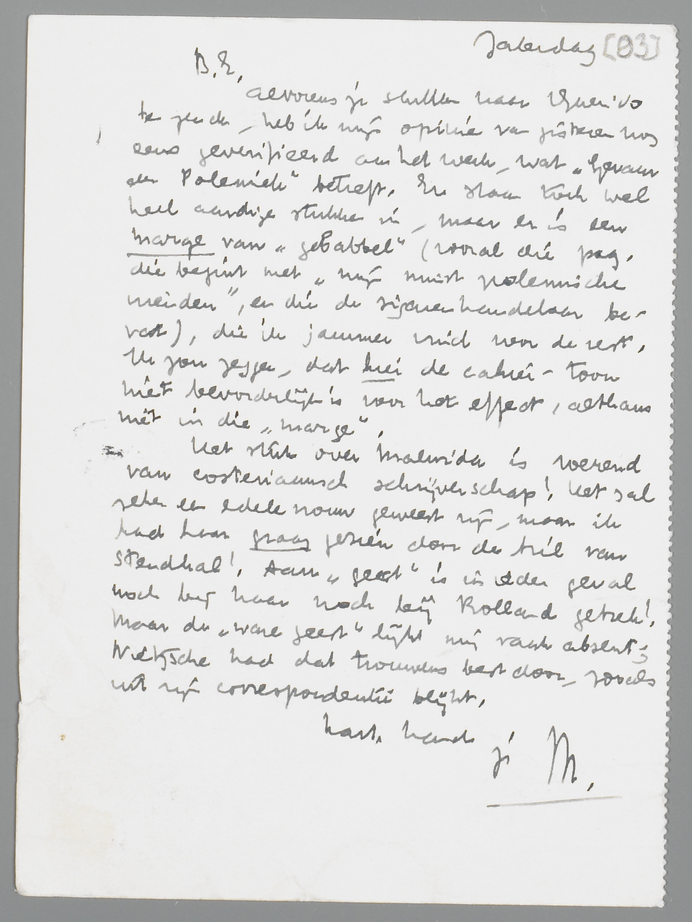 Alvorens je stukken naar Querido te zenden, heb ik mijn opinie van gisteren nog eens geverifieerd aan het werk, wat Gevaar der Polemiek betreft. Er staan toch wel heel aardige stukken in, maar er is een marge van ‘gebabbel’ (vooral die pag. die begint met ‘mijn minst polemische vrienden’, en die de sigarenhandelaar bevat), die ik jammer vind voor de rest. Ik zou zeggen, dat hier de cahier-toon niet bevorderlijk is voor het effect, althans niet in die ‘marge’.