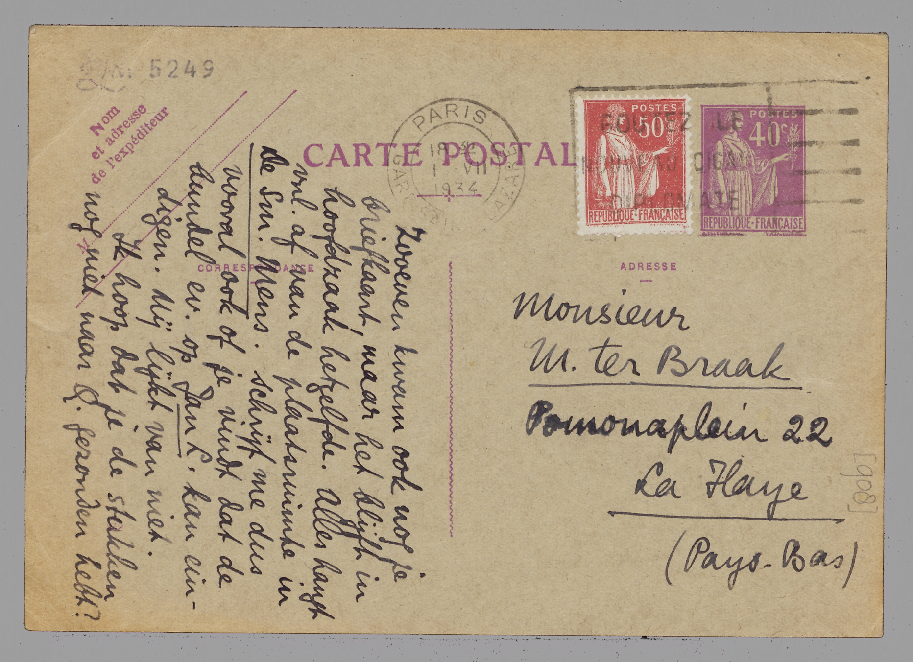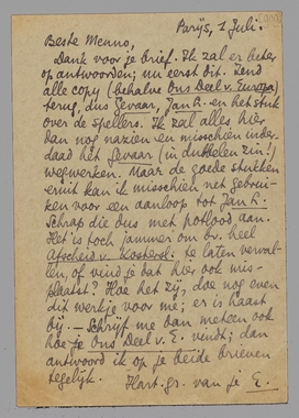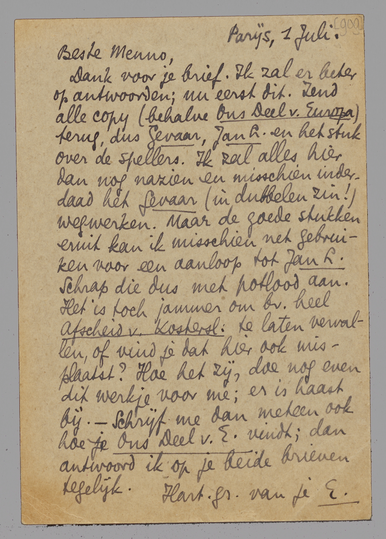 Dank voor je brief. Ik zal er beter op antwoorden; nu eerst dit. Zend alle copy (behalve Ons Deel v. Europa) terug, dus Gevaar, Jan L. en het stuk over de spellers. Ik zal alles hier dan nog nazien en misschien inderdaad het Gevaar (in dubbelen zin!) wegwerken. Maar de goede stukken eruit kan ik misschien net gebruiken voor een aanloop tot Jan L. Schrap die dus met potlood aan. Het is toch jammer om bv. heel Afscheid v. Kostersl. te laten vervallen, of vind je dat hier ook misplaatst? Hoe het zij, doe nog even dit werkje voor me; er is haast bij. - Schrijf me dan meteen ook hoe je Ons Deel v.E. vindt; dan antwoord ik op je beide brieven tegelijk.