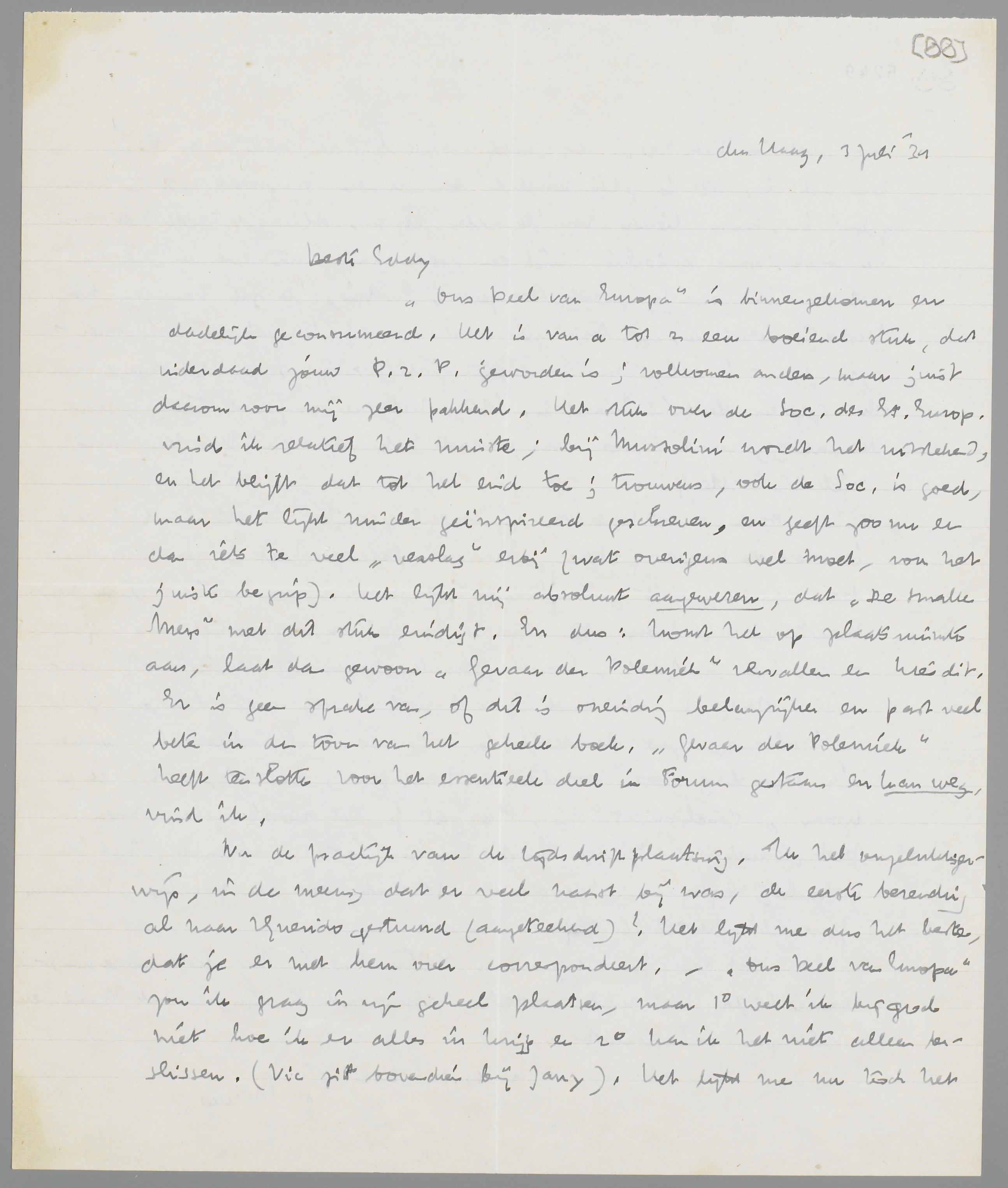 Ons Deel van Europa is binnengekomen en dadelijk geconsumeerd. Het is van a tot z een boeiend stuk, dat inderdaad jouw P.z.P. geworden is; volkomen anders, maar juist daarom voor mij zeer pakkend. Het stuk over de Soc. des Es. Europ. vind ik relatief het minste; bij Mussolini wordt het uitstekend, en het blijft dat tot het eind toe; trouwens, ook de Soc. is goed, maar het lijkt minder geïnspireerd geschreven, en geeft zoo nu en dan iets te veel ‘verslag’ erbij (wat overigens wel moet, voor het juiste begrip). Het lijkt mij absoluut aangewezen, dat De Smalle Mensch met dit stuk eindigt. En dus: Komt het op plaatsruimte aan, laat dan gewoon Gevaar der Polemiek vervallen en kies dit. Er is geen sprake van, of dit is oneindig belangrijker en past veel beter in den toon van het geheele boek. Gevaar der Polemiek heeft tenslotte voor het essentieele deel in Forum gestaan en kan weg, vind ik.