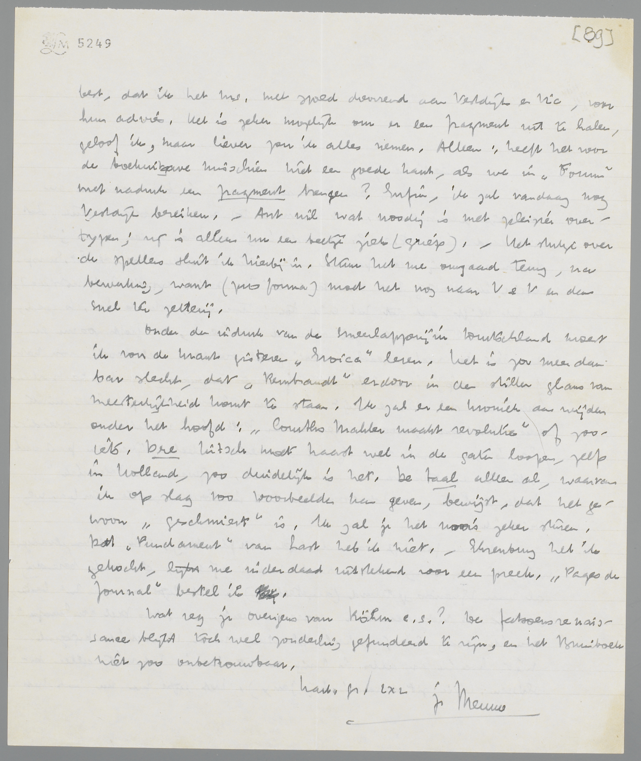 Onder den indruk van de smeerlapperij in Duitsland moest ik voor de krant gisteren Eroica lezen. Het is zoo meer dan bar slecht, dat Rembrandt erdoor in den stillen glans van meesterlijkheid komt te staan. Ik zal er een kroniek aan wijden onder het hoofd: Courths Mahler maakt revolutie of zooiets. Deze kitsch moet haast wel in de gaten loopen, zelfs in Holland, zoo duidelijk is het. De taal alleen al, waarvan ik op slag 100 voorbeelden kan geven, bewijst, dat het gewoon ‘geschmiert’ is. Ik zal je het moois zeker sturen. Dat Fundament van Last heb ik niet. - Ehrenburg heb ik gekocht, lijkt me inderdaad uitstekend voor een preek. Pages de Journal bestel ik.