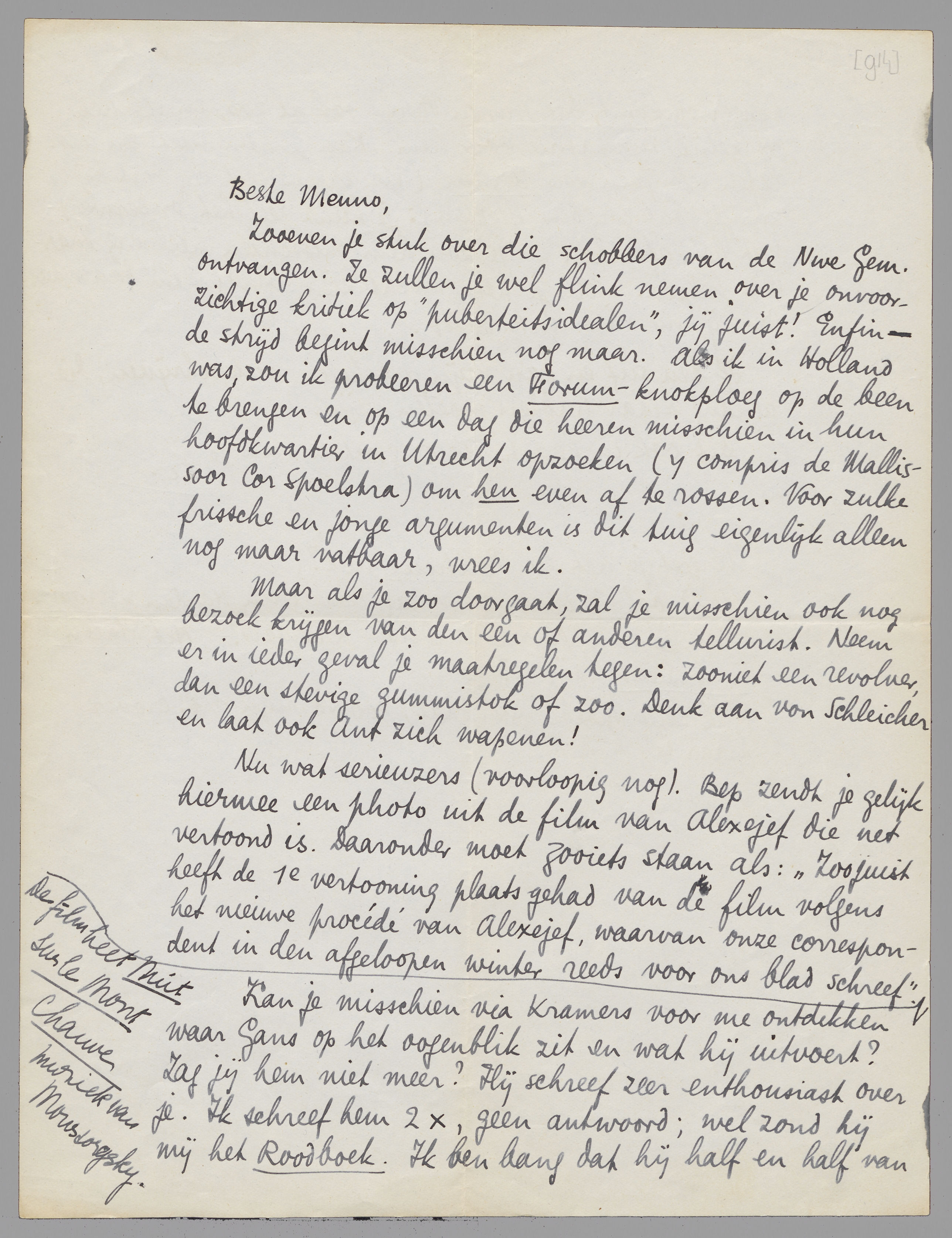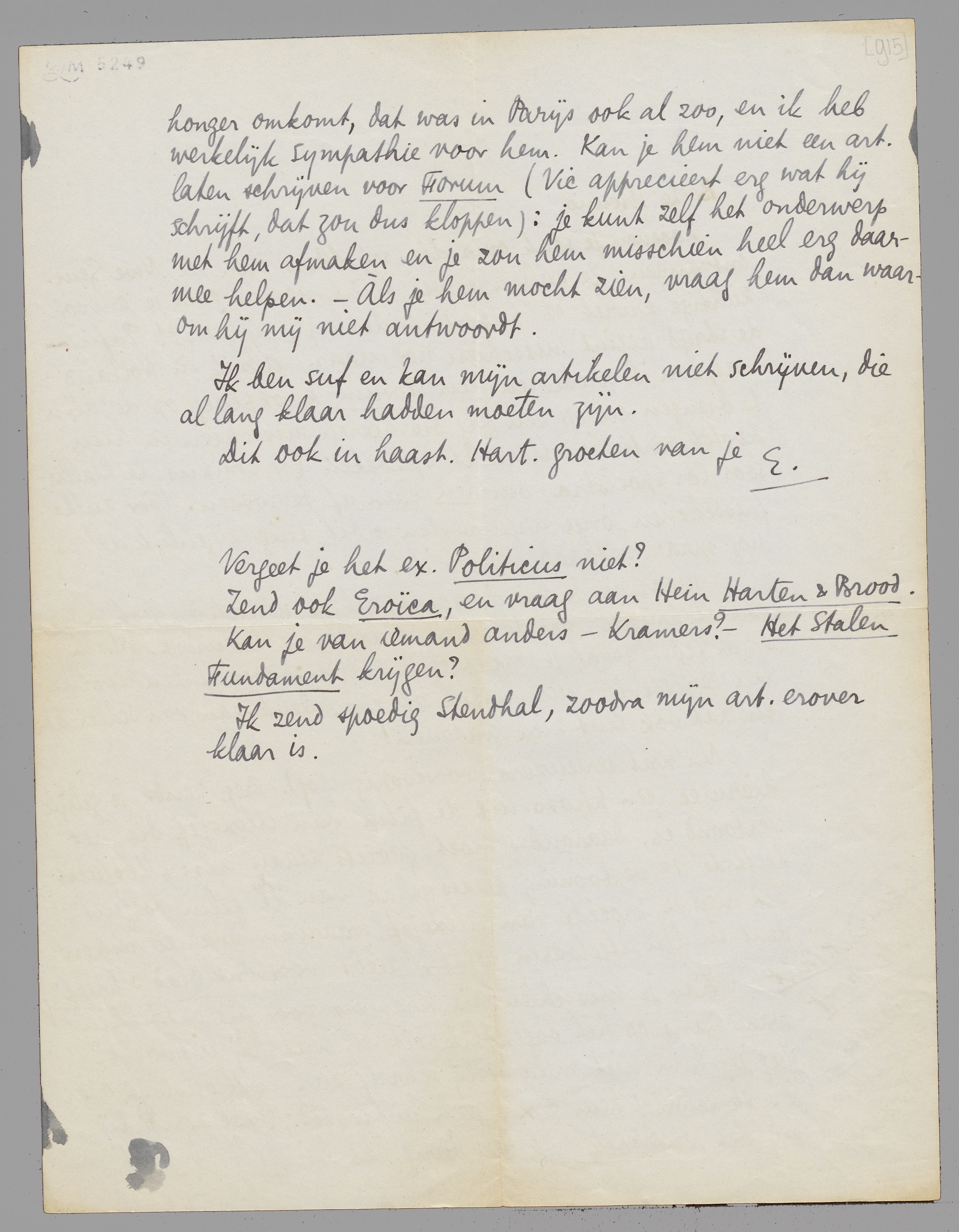 Zooeven je stuk over die schobbers van de Nwe Gem. ontvangen. Ze zullen je wel flink nemen over je onvoorzichtige kritiek op ‘puberteitsidealen’, jij juist! Enfin - de strijd begint misschien nog maar. Als ik in Holland was, zou ik probeeren een Forum-knokploeg op de been te brengen en op een dag die heeren misschien in hun hoofdkwartier in Utrecht opzoeken (y compris de Mallissoor Cor Spoelstra) om hen even af te rossen. Voor zulke frissche en jonge argumenten is dit tuig eigenlijk alleen nog maar vatbaar, vrees ik.