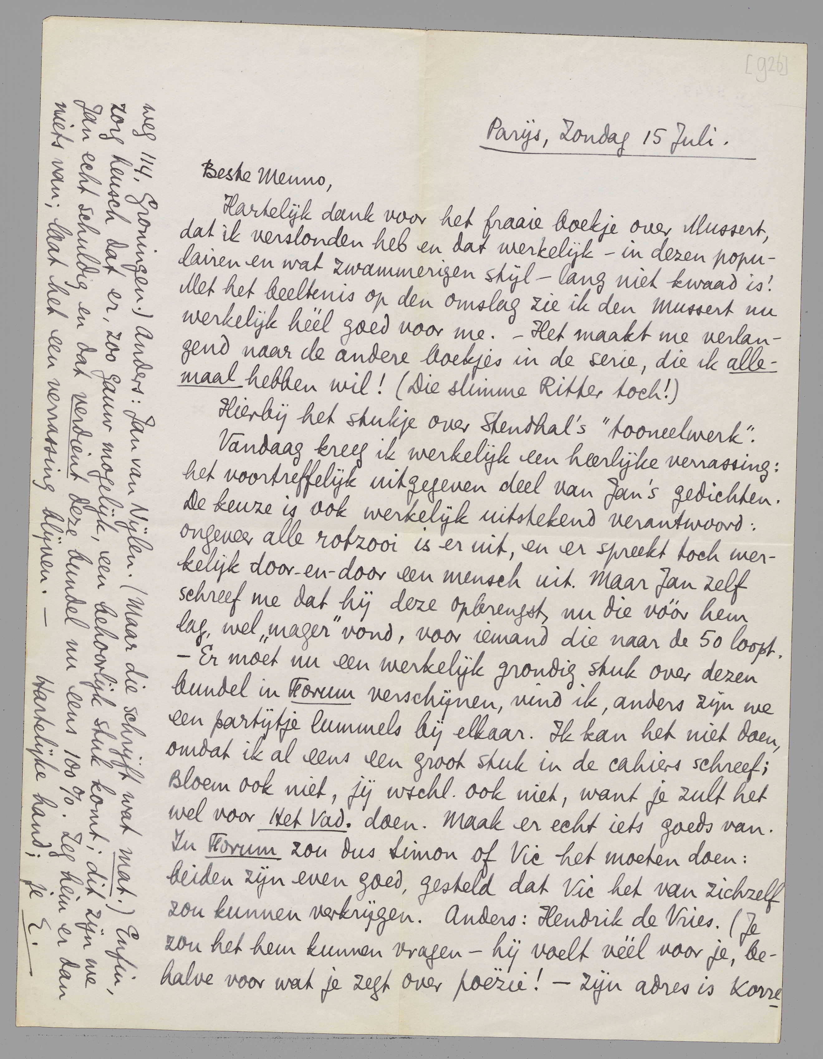 Vandaag kreeg ik werkelijk een heerlijke verrassing: het voortreffelijk uitgegeven deel van Jan's gedichten. De keuze is ook werkelijk uitstekend verantwoord: ongeveer alle rotzooi is er uit, en er spreekt toch werkelijk door-en-door een mensch uit. Maar Jan zelf schreef me dat hij deze opbrengst nu die vóór hem lag, wel ‘mager’ vond, voor iemand die naar de 50 loopt. - Er moet nu een werkelijk grondig stuk over dezen bundel in Forum verschijnen, vind ik, anders zijn we een partijtje lummels bij elkaar. Ik kan het niet doen, omdat ik al eens een groot stuk in de cahiers schreef; Bloem ook niet, jij wschl. ook niet, want je zult het wel voor Het Vad. doen. Maak er echt iets goeds van. In Forum zou dus Simon of Vic het moeten doen: beiden zijn even goed, gesteld dat Vic het van zichzelf zou kunnen verkrijgen. Anders: Hendrik de Vries. (Je zou het hem kunnen vragen - hij voelt véél voor je, behalve voor wat je zegt over poëzie! - Zijn adres is Korreweg 114, Groningen.) Anders Jan van Nijlen. (Maar die schrijft wat mat.) Enfin, zorg heusch dat er, zo gauw mogelijk, een behoorlijk stuk komt; dit zijn we Jan echt schuldig en dat verdient deze bundel nu eens 100%. Zeg hèm er dan niets van; laat het een verrassing blijven. -