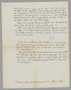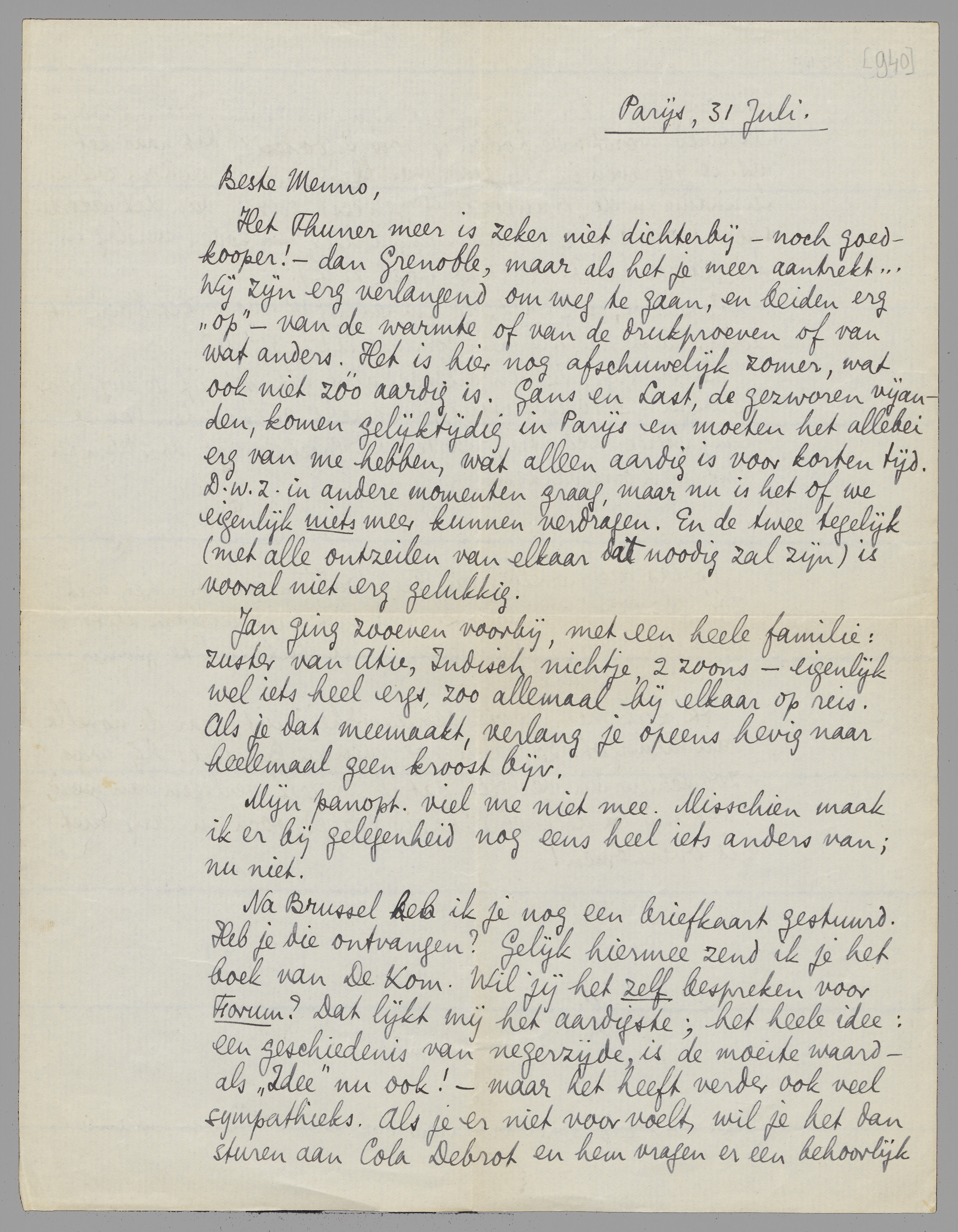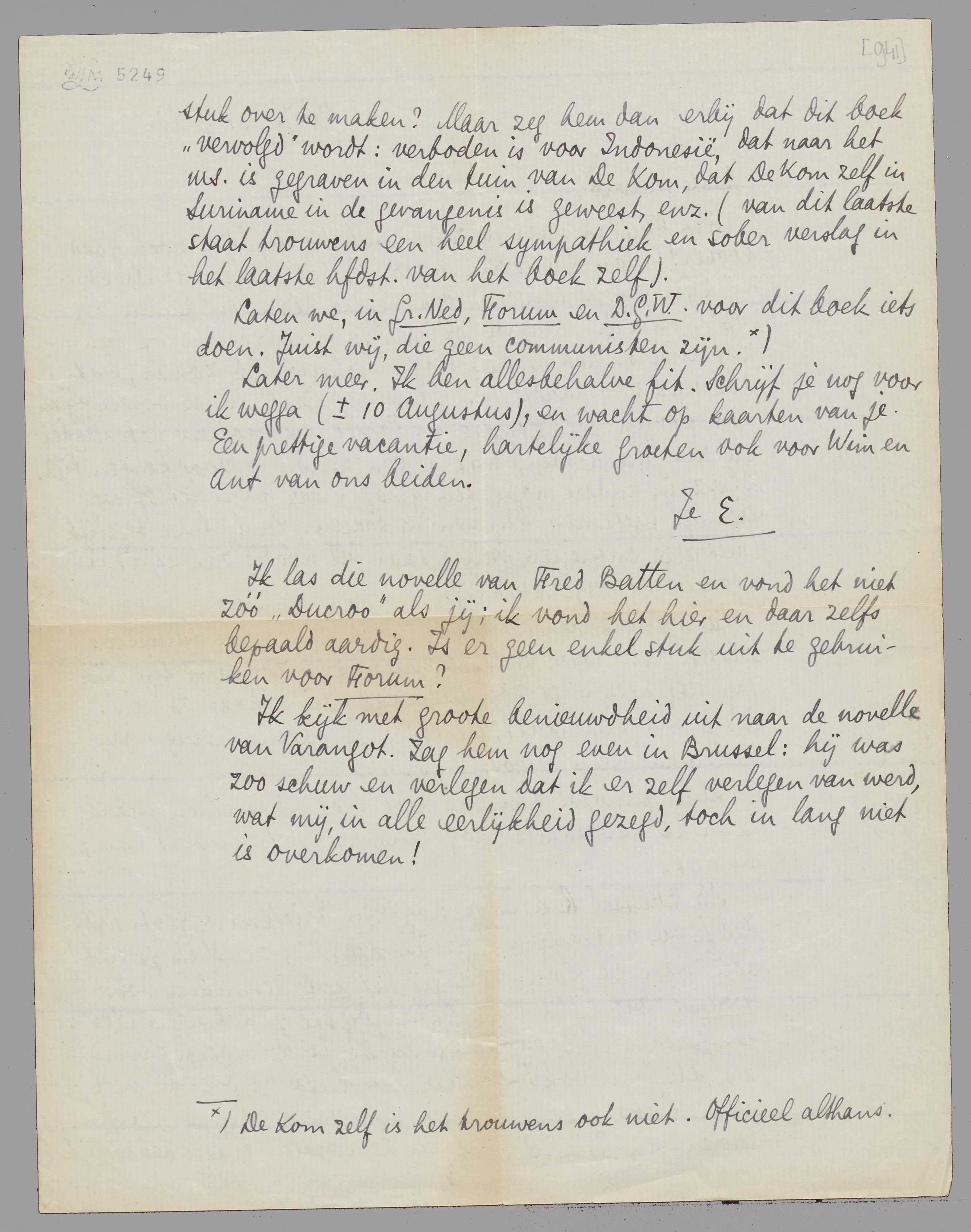 Na Brussel heb ik je nog een briefkaart gestuurd. Heb je die ontvangen? Gelijk hiermee zend ik je het boek van De Kom. Wil jij het zelf bespreken voor Forum? Dat lijkt mij het aardigste; het heele idee: een geschiedenis van negerzijde, is de moeite waard - als ‘Idee’ nu ook! - maar het heeft verder ook veel sympathieks. Als je er niet voor voelt, wil je het dan sturen aan Cola Debrot en hem vragen er een behoorlijk stuk over te maken? Maar zeg hem dan erbij dat dit boek ‘vervolgd’ wordt: verboden is voor Indonesië, dat naar het ms. is gegraven in den tuin van De Kom, dat De Kom zelf in Suriname in de gevangenis is geweest, enz. (van dit laatste staat trouwens een heel sympathiek en sober verslag in het laatste hfdst. van het boek zelf).