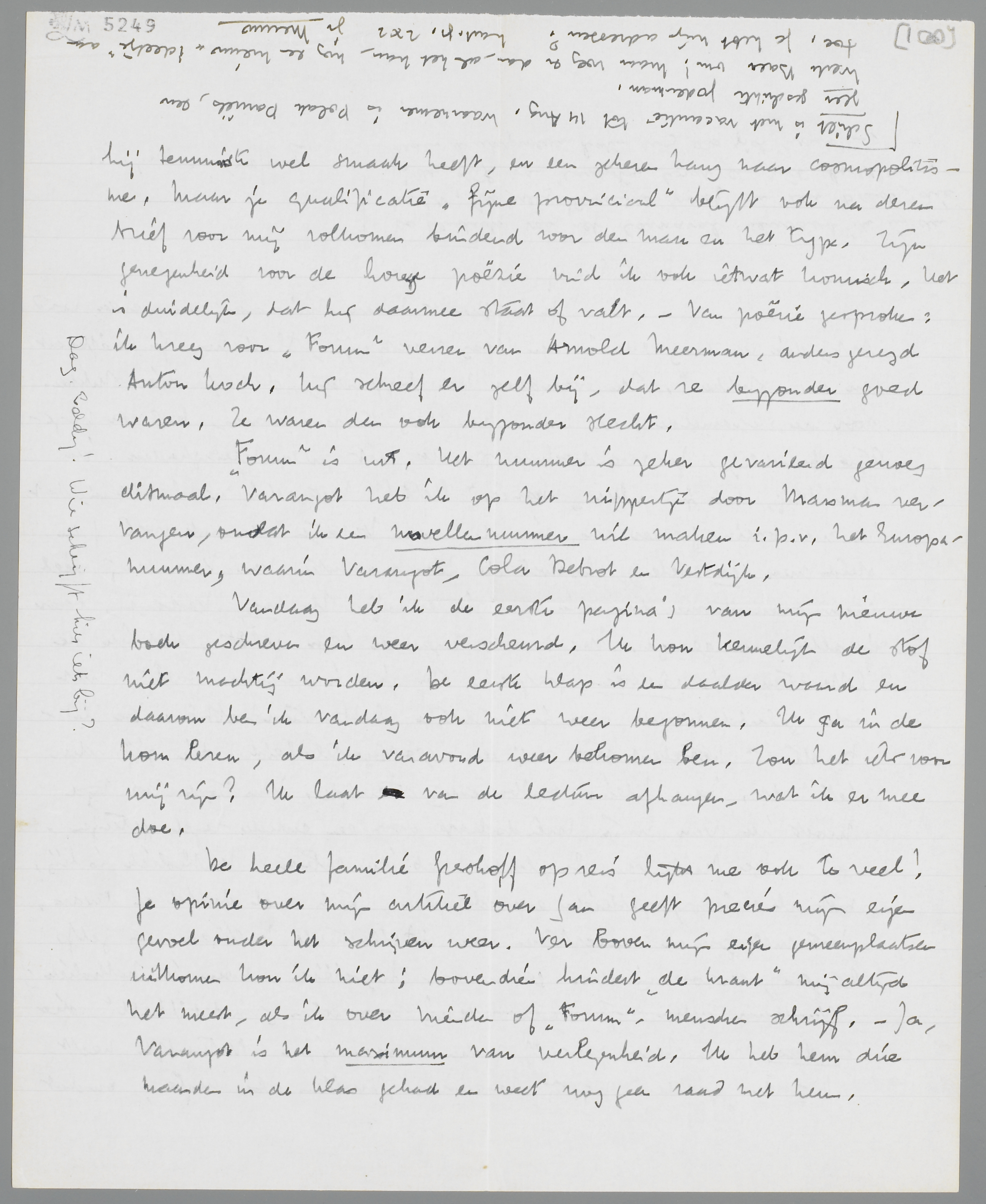 De heele familie Greshoff op reis lijkt me ook te veel! Je opinie over mijn artikel over Jan geeft precies mijn eigen gevoel onder het schrijven weer. Ver boven mijn eigen gemeenplaatsen uitkomen kon ik niet; bovendien hindert ‘de krant’ mij altijd het meest, als ik over vrienden of Forum-menschen schrijf. - Ja, Varangot is het maximum van verlegenheid. Ik heb hem drie maanden in de klas gehad en weet nog geen raad met hem.