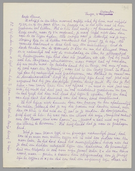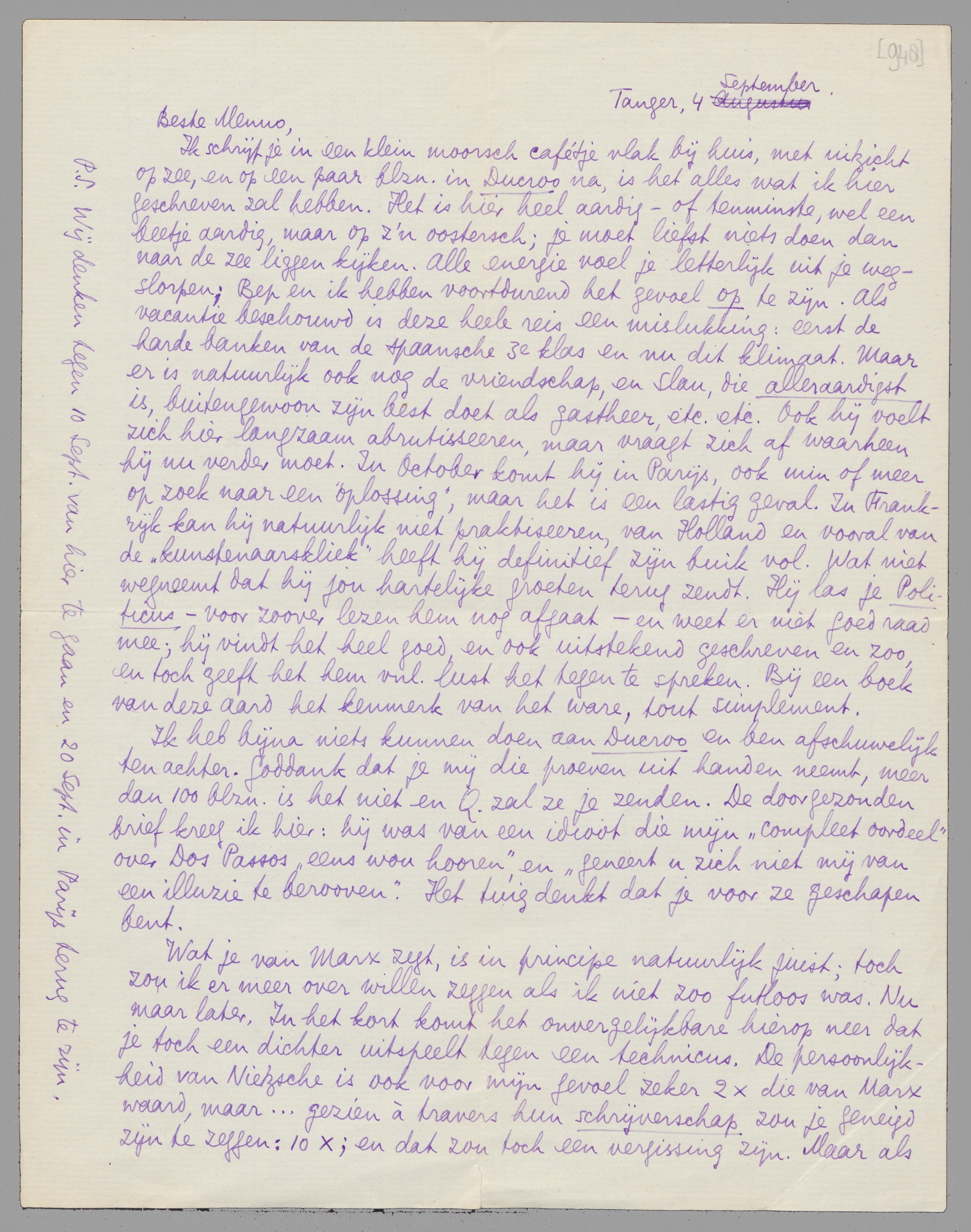 Ik schrijf je in een klein moorsch cafétje vlak bij huis, met uitzicht op zee, en op een paar blzn. in Ducroo na, is het alles wat ik hier geschreven zal hebben. Het is hier heel aardig - of tenminste, wel een beetje aardig, maar op z'n oostersch; je moet liefst niets doen dan naar de zee liggen kijken. Alle energie voel je letterlijk uit je wegslorpen; Bep en ik hebben voortdurend het gevoel op te zijn. Als vacantie beschouwd is deze heele reis een mislukking: eerst de harde banken van de spaansche 3e klas en nu dit klimaat. Maar er is natuurlijk ook nog de vriendschap, en Slau, die alleraardigst is, buitengewoon zijn best doet als gastheer, etc. etc. Ook hij voelt zich hier langzaam abrutisseeren, maar vraagt zich af waarheen hij nu verder moet. In October komt hij in Parijs, ook min of meer op zoek naar een ‘oplossing’, maar het is een lastig geval. In Frankrijk kan hij natuurlijk niet praktiseeren, van Holland en vooral van de ‘kunstenaarskliek’ heeft hij definitief zijn buik vol. Wat niet wegneemt dat hij jou hartelijke groeten terug zendt. Hij las je Politicus - voor zoover lezen hem nog afgaat - en weet er niet goed raad mee; hij vindt het heel goed, en ook uitstekend geschreven en zoo, en toch geeft het hem vnl. lust het tegen te spreken. Bij een boek van deze aard het kenmerk van het ware, tout simplement.