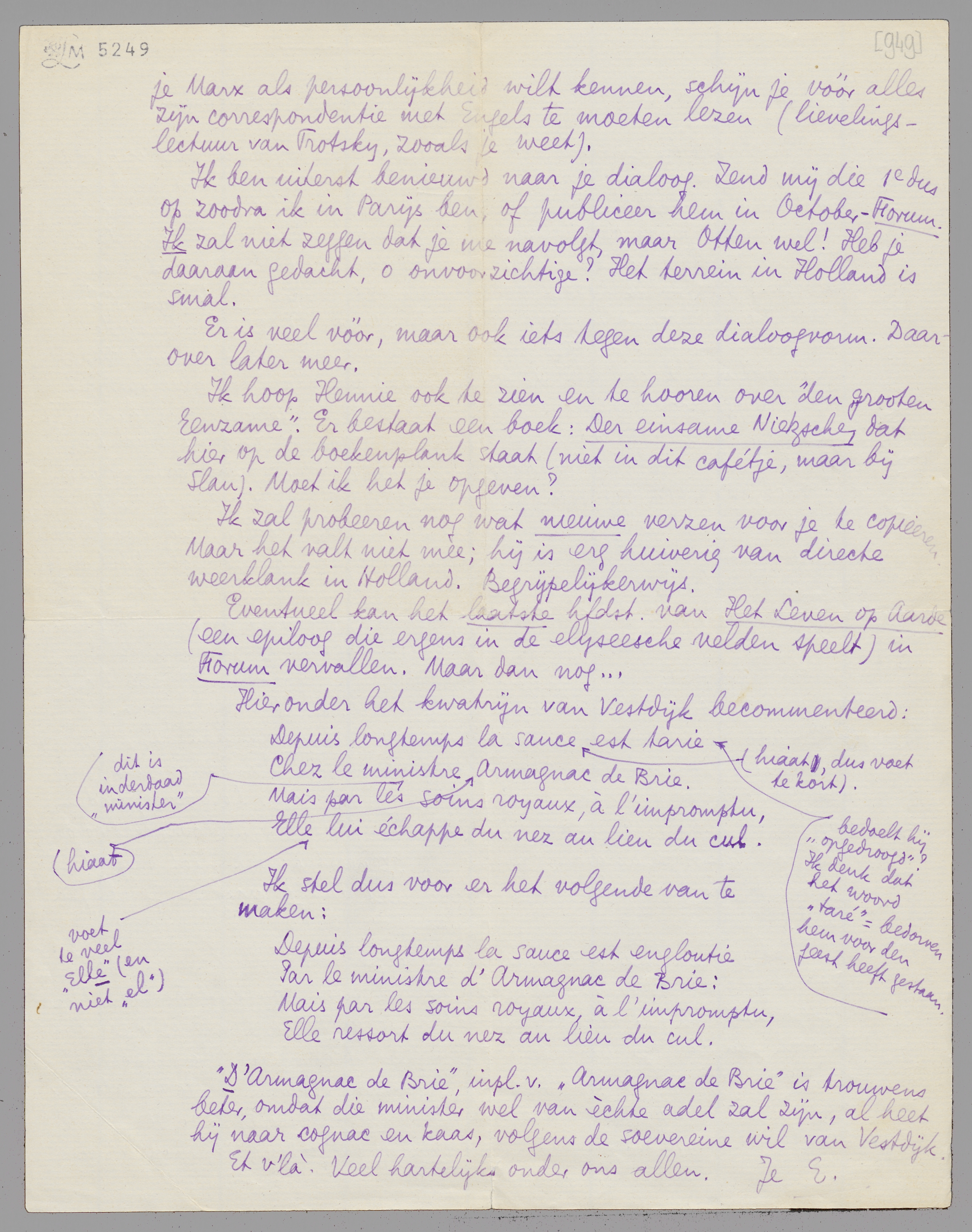 Ik ben uiterst benieuwd naar je dialoog. Zend mij die 1e dus op zoodra ik in Parijs ben of publiceer hem in October-Forum. Ik zal niet zeggen dat je me navolgt, maar Otten wel! Heb je daaraan gedacht, o onvoorzichtige? Het terrein in Holland is smal. Er is veel vóór, maar ook iets tegen deze dialoogvorm. Daarover later meer.