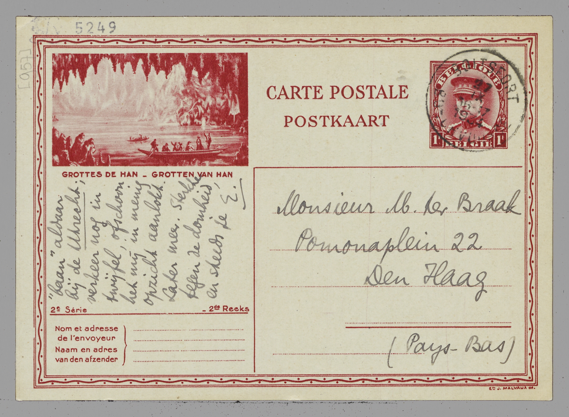 Dank voor brief en drukproeven: alles is gisteren behouden hier aangekomen en de proeven zijn eindelijk voor goed terug, met een paar slotregels. Wat je me schrijft is voor mij bijna geheel in orde, met uitzondering van de manier waarop je je ‘verschuivingen’ op rekening van iets anders zet dan juist van je onherstelbaar cerebrale constructie. Maar wat doet dat ertoe? in laatste instantie zijn wij het eens, ook over de verhouding waarin wij zelf tot elkaar staan: de vriendschap. Daar naast verkeer ik op het oogenblik in een staat van vermoeidheid, waardoor ik eigenlijk alles wat intellectueel is zou willen ontvluchten. Dat gaat hier in Boitsfort dan wonderwel; jammer alleen dat het een week duurt en niet een maand bv. De prikken doen ons beiden schijnbaar veel goed. Volgende week Maandag weer Parijs. Ik heb kans op een ‘baan’ aldaar bij de Utrecht; verkeer nog in twijfel, ofschoon het mij in menig opzicht aanlokt. Later meer. Sterkte tegen de domheid en steeds je