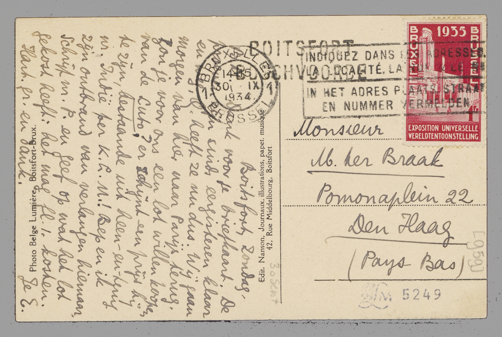 - Dank voor je briefkaart. De proeven zijn sinds eergisteren klaar en weg, Q. heeft ze nu dus. Wij gaan morgen van hier naar Parijs terug. Zou je voor ons een lot willen koopen van de Luto? er schijnt een prijs bij te zijn, bestaande uit heen-en-terug nr. Indië per K.L.M.! Bep en ik zijn ontbrand van verlangen hiernaar. Schrijf nr. P. en geef op wat het lot gekost heeft: het mag fl. 1. kosten.