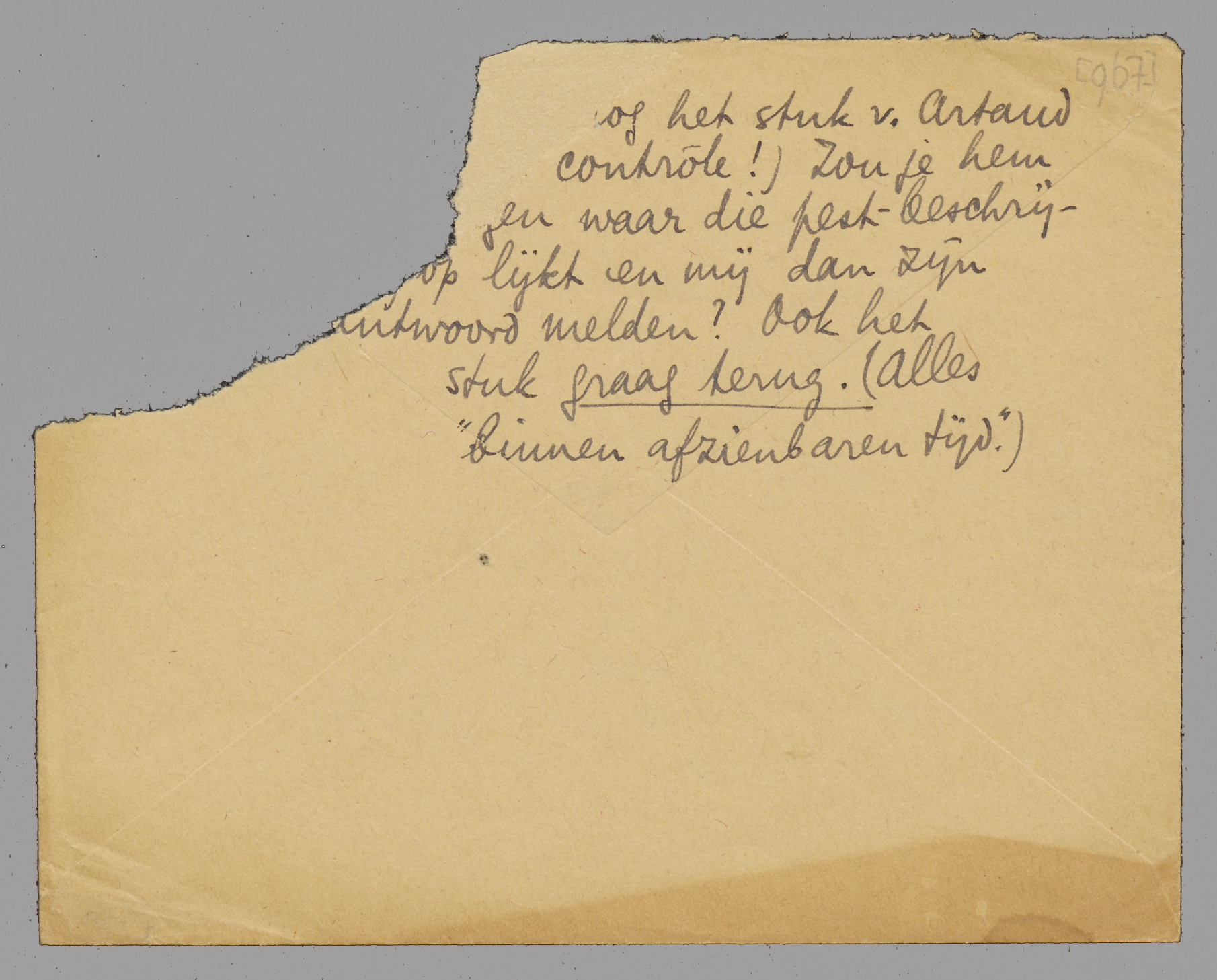 [...] nog het stuk van Artaud [...] controle!) Zou je hem [...] vragen waar die pest-beschrijving op lijkt en mij dan zijn antwoord melden? Ook het stuk graag terug. (Alles ‘binnen afzienbaren tijd’.)