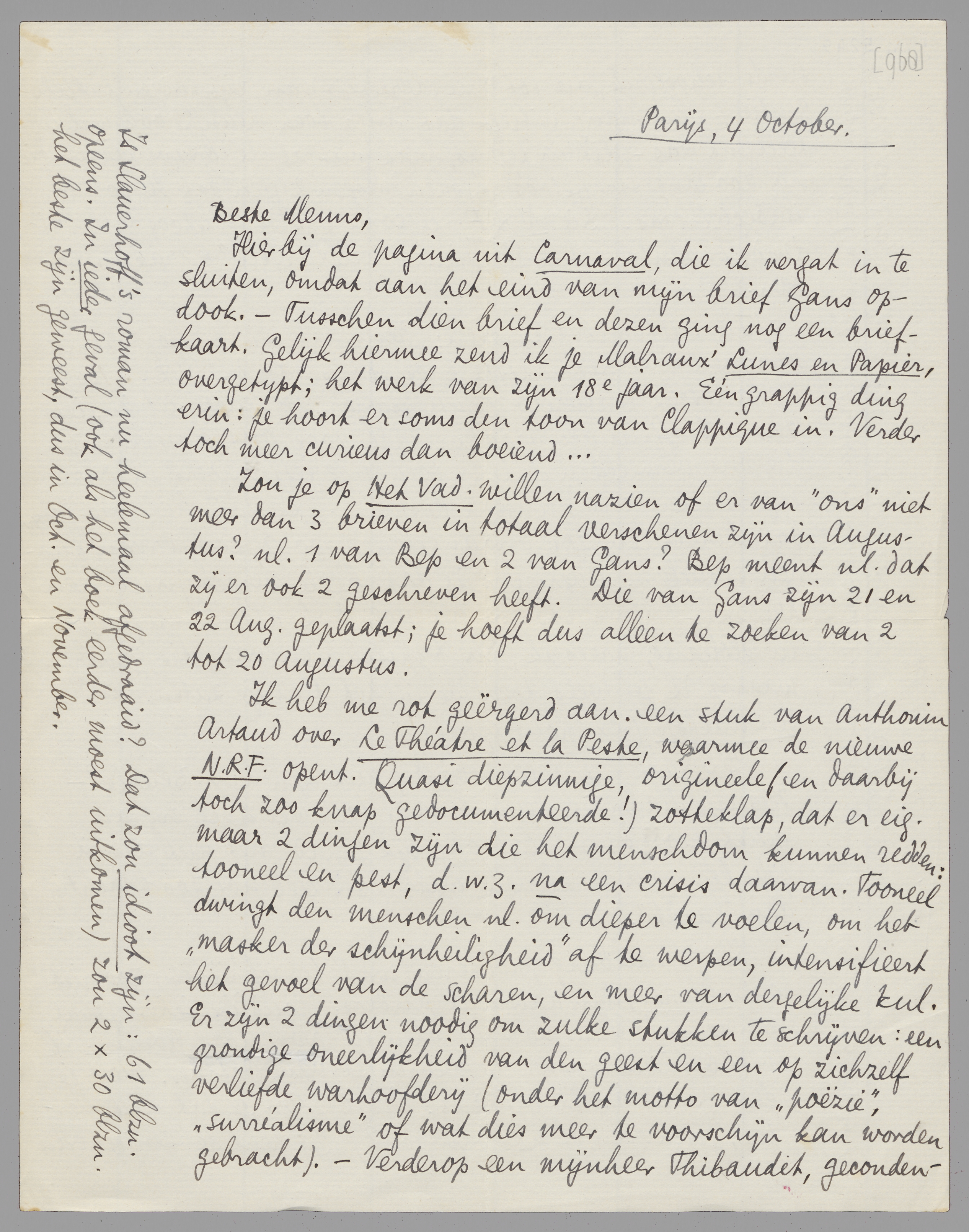 Hierbij de pagina uit Carnaval, die ik vergat in te sluiten, omdat aan het eind van mijn brief Gans opdook. - Tusschen dien brief en dezen ging nog een briefkaart. Gelijk hiermee zend ik je Malraux' Lunes en Papier, overgetypt; het werk van zijn 18e jaar. Eén grappig ding erin: je hoort er soms den toon van Clappique in. Verder toch meer curieus dan boeiend...
