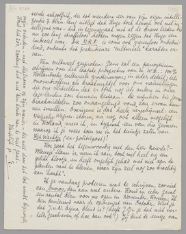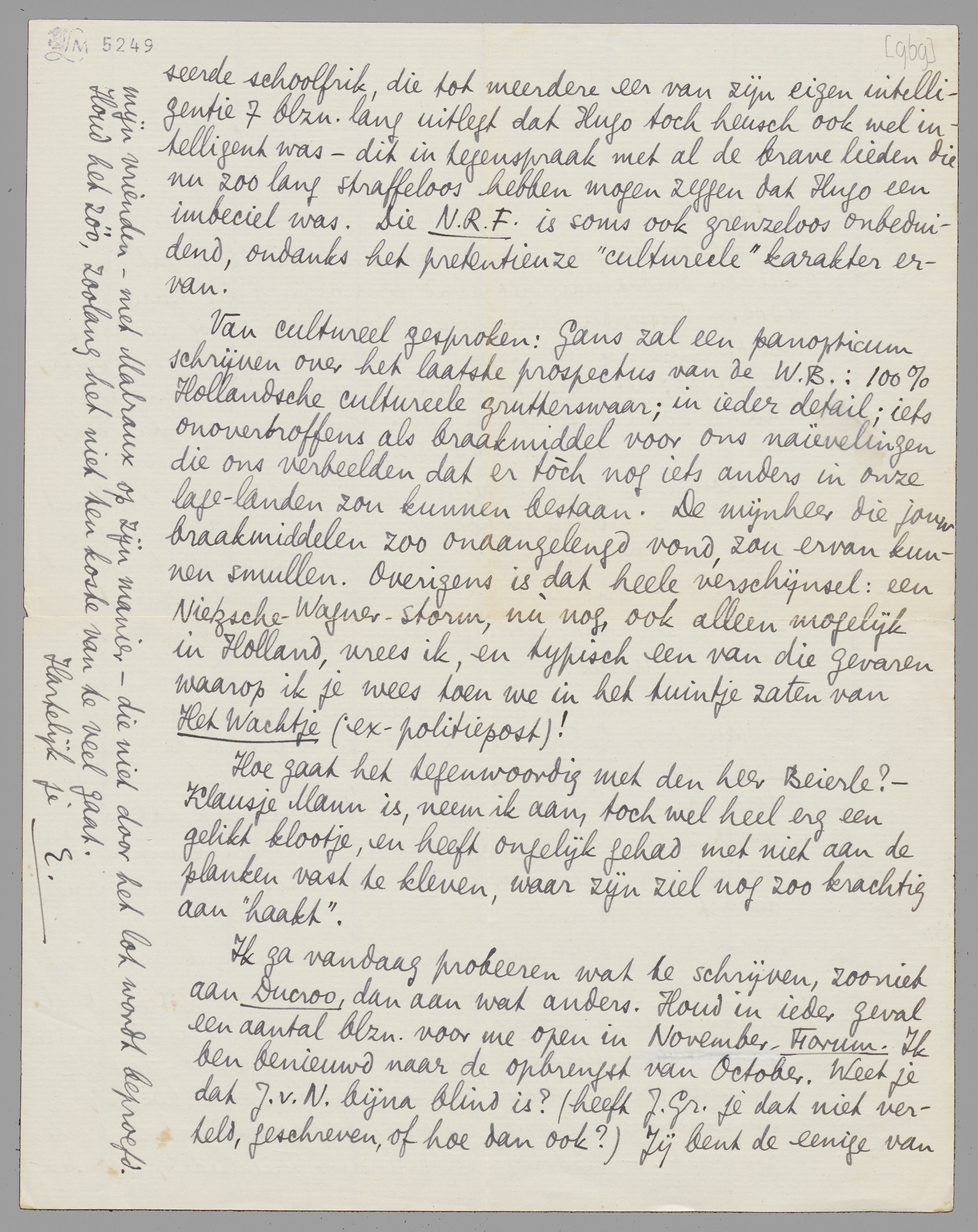 Van cultureel geproken: Gans zal een panopticum schrijven over het laatste prospectus van de W.B.: 100% Hollandsche cultureele grutterswaar; in ieder detail; iets onovertroffens als braakmiddel voor ons naïevelingen die ons verbeelden dat er tòch nog iets anders in onze lage-landen zou kunnen bestaan. De mijnheer die jouw braakmiddelen zoo onaangelengd vond, zou ervan kunnen smullen. Overigens is dat heele verschijnsel: een Nietzsche-Wagner-storm, nù nog, ook alleen mogelijk in Holland, vrees ik, en typisch een van die gevaren waarop ik je wees toen we in het tuintje zaten van Het Wachtje (ex-politiepost)!