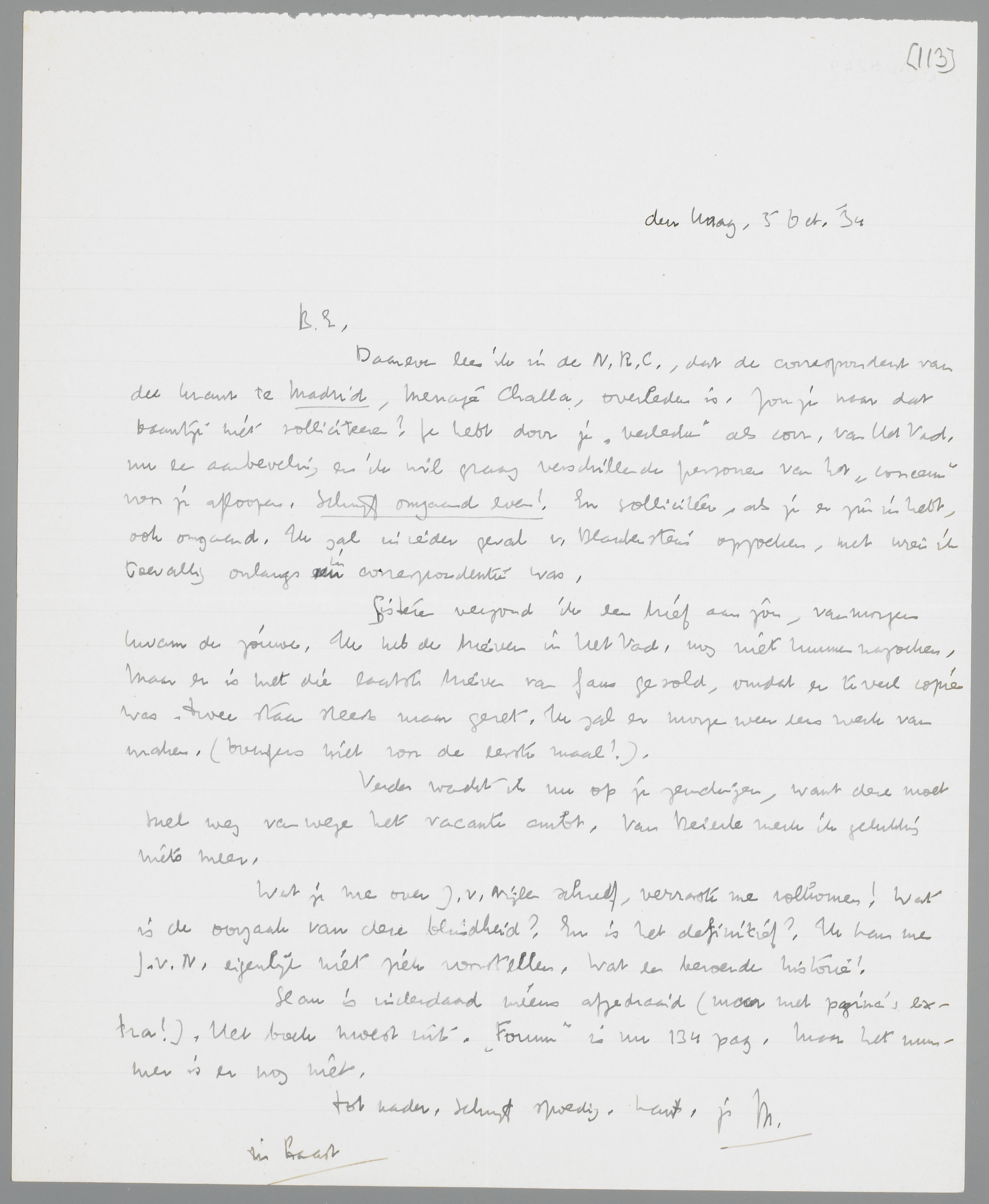 Daareven lees ik in de N.R.C., dat de correspondent van die krant te Madrid, Menagé Challa, overleden is. Zou je naar dat baantje niet solliciteeren? Je hebt door je ‘verleden’ als corr. van Het Vad. nu een aanbeveling en ik wil graag verschillende personen van het ‘concern’ voor je afloopen. Schrijf omgaand even! En solliciteer, als je er zin in hebt, ook omgaand. Ik zal in ieder geval v. Blankenstein opzoeken, met wien ik toevallig onlangs in correspondentie was.