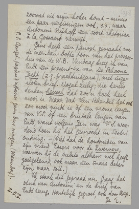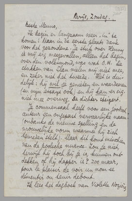 Ik begin er langzaam weer ‘in’ te komen! Maar in de eerste plaats dank voor het gezondene. Je stuk over Henny is me erg meegevallen, alleen het begin, over den volksmond, was wat O.H. De stukken van Slau vielen mij niet mee, en zeker niet het tweede. Het is duidelijk: hij wil je genieten en waardeeren (en mijn essays ook) en hij kan er eig. niet mee overweg. De dichter steigert.