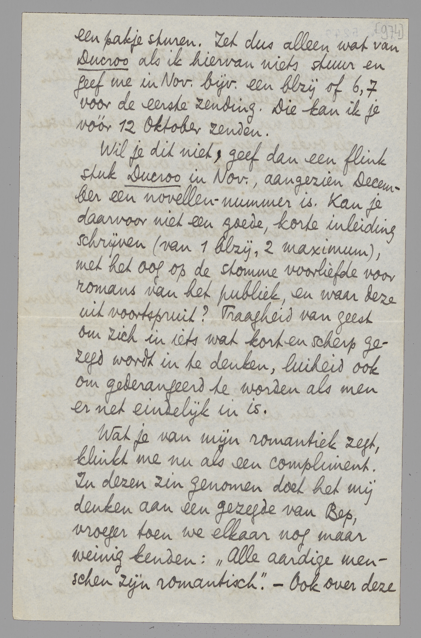 Wat je van mijn romantiek zegt, klinkt me nu als een compliment. In dezen zin genomen doet het mij denken aan een gezegde van Bep, vroeger toen we elkaar nog maar weinig kenden: ‘Alle aardige menschen zijn romantisch’. - Ook over deze romantiek, en wat men zoo noemt, zou ik eenige opmerkingen ten beste willen geven, bij gelegenheid.
