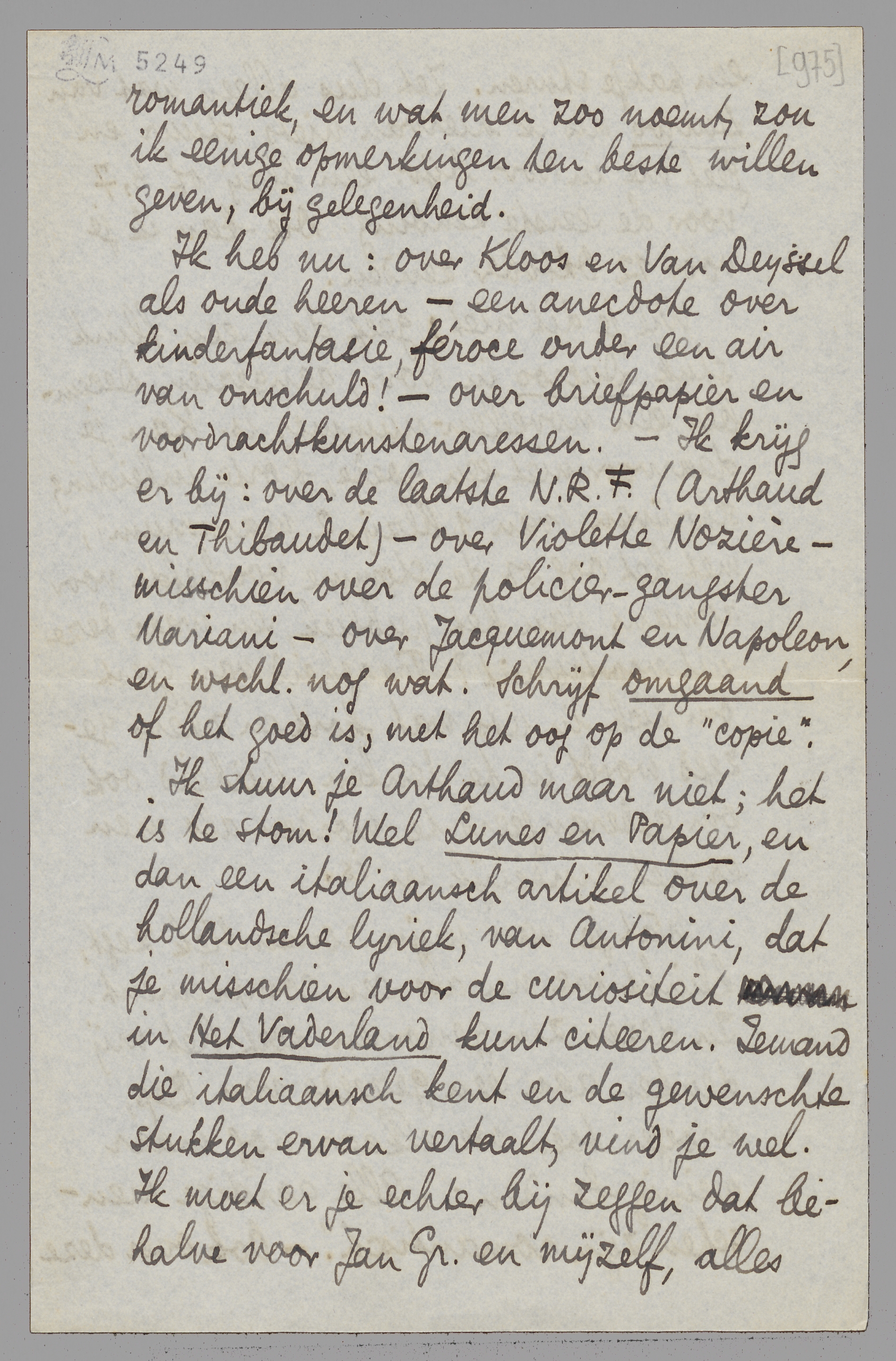 Ik stuur je Arthaud maar niet; het is te stom! Wel Lunes en papier, en dan een italiaansch artikel over de hollandsche lyriek, van Antonini, dat je misschien voor de curiositeit in Het Vaderland kunt citeeren. Iemand die italiaansch kent en de gewenschte stukken ervan vertaalt, vind je wel. Ik moet er je echter bij zeggen dat behalve voor Jan Gr. en mijzelf, alles zoowat uit mijn koker komt - minus een paar vergissingen ook, o.a. waar Antonini Nijhoff een soort rhetorica à la Gossaert verwijt.