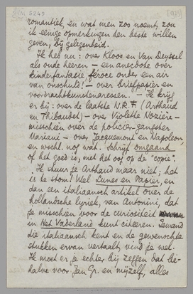 Ik heb nu: over Kloos en Van Deyssel als oude heeren - een anecdote over kinderfantasie, féroce onder een air van onschuld! - over briefpapier en voordrachtkunstenaressen. - Ik krijg er bij: over de laatste N.R.F. (Arthaud en Thibaudet) - over Violette Nozière - misschien over de policier-gangster Mariani - over Jacquemont en Napoleon, en wschl. nog wat. Schrijf omgaand of het goed is, met het oog op de ‘copie’.