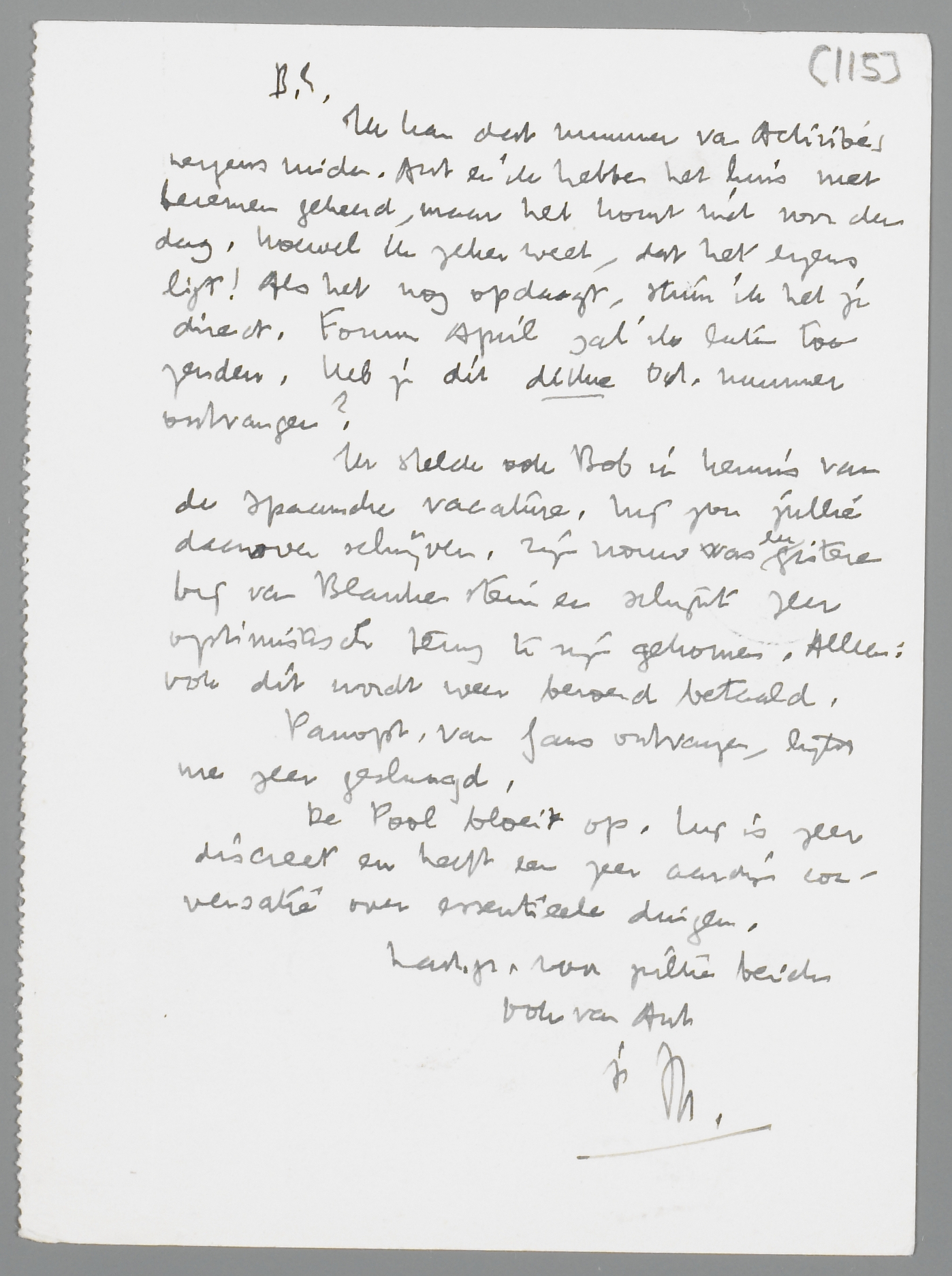 Ik stelde ook Bob in kennis van de Spaansche vacature. Hij zou jullie daarover schrijven. Zijn vrouw was eergisteren bij van Blankenstein en schijnt zeer optimistisch terug te zijn gekomen. Alleen: ook dit wordt weer beroerd betaald.