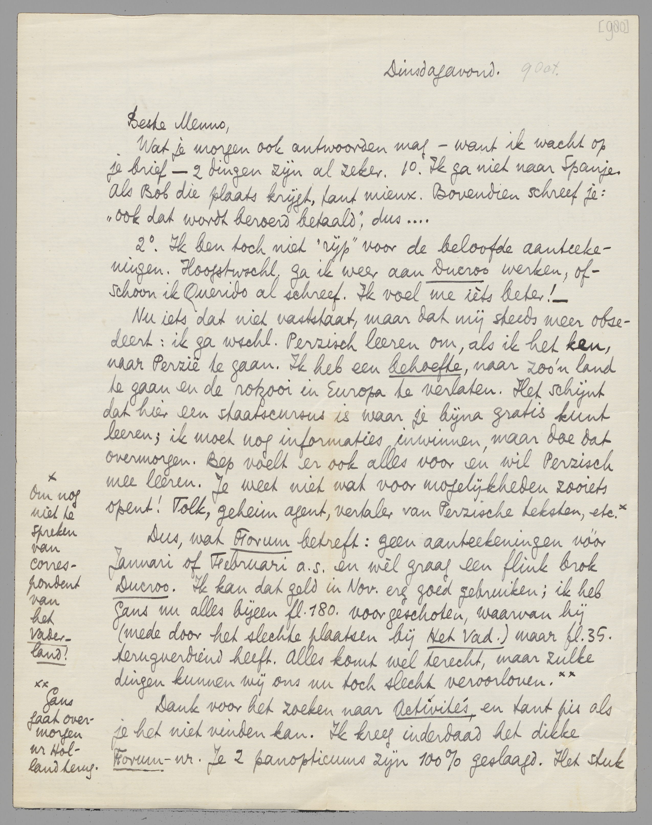 Nu iets dat niet vaststaat, maar dat mij steeds meer obsedeert: ik ga wschl. Perzisch leeren om, als ik het ken, naar Perzië te gaan. Ik heb een behoefte, naar zoo'n land te gaan en de rotzooi in Europa te verlaten. Het schijnt dat hier een staatscursus is, waar je bijna gratis kunt leeren; ik moet nog informaties inwinnen, maar doe dat overmorgen. Bep voelt er ook alles voor en wil Perzisch mee leeren. Je weet niet wat voor mogelijkheden zooiets opent! Tolk, geheim agent, vertaler van Perzische teksten, etc. [Om nog niet te spreken van correspondent van het Vaderland!]