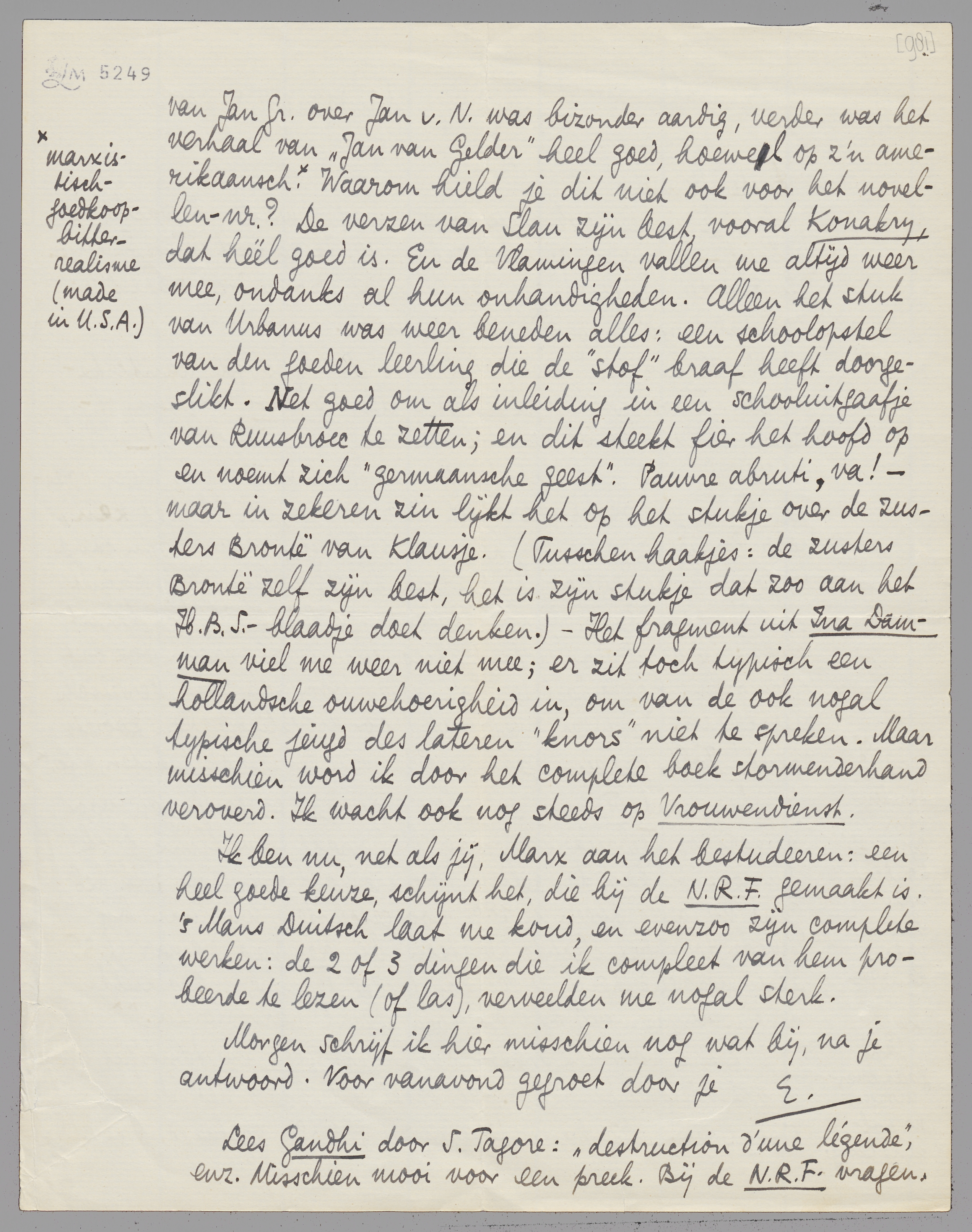 Ik ben nu, net als jij, Marx aan het bestudeeren: een heel goede keuze, schijnt het, die bij de N.R.F. gemaakt is. 's Mans Duitsch laat me koud, en evenzoo zijn complete werken: de 2 of 3 dingen die ik compleet van hem probeerde te lezen (of las), verveelden me nogal sterk.