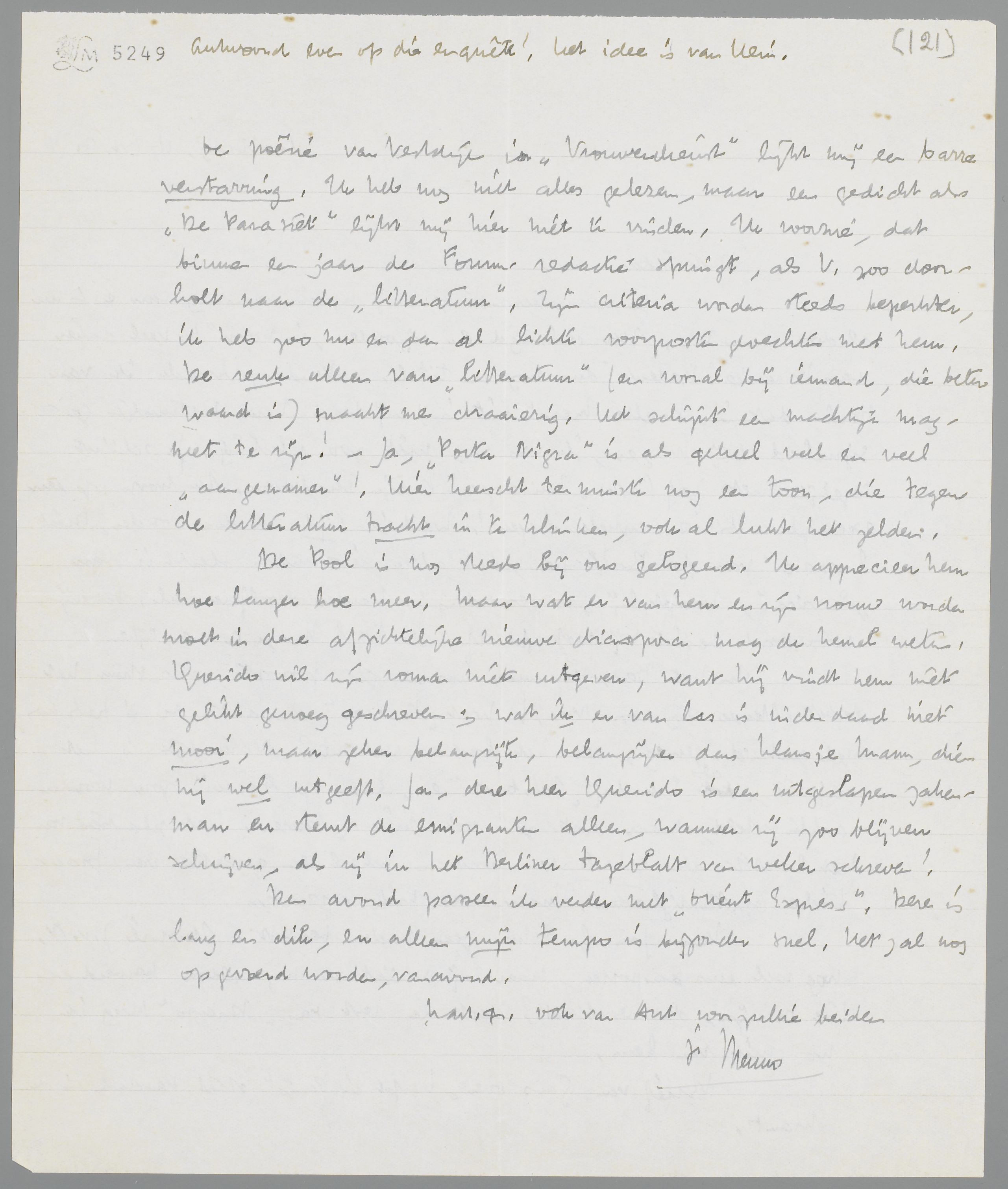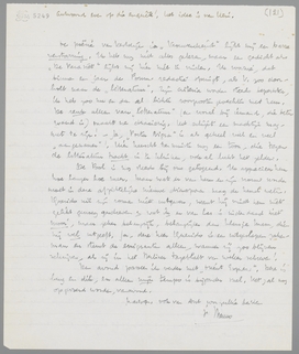 Je aangeteekende zending kwam vandaag aan en is nu al door naar Vic. Zeer geslaagd en bijzonder ‘in vorm’! Veel raker dan Maurice. Bedenk dus nog een titel. - Vandaag hoorde ik van Hein, dat je Smalle Mens uit is; hij had hem natuurlijk gesignaleerd bij Mayer, ik was nog niet zoo gelukkig. Je schijnt tegelijk met Jef Lasts Zuiderzee te zijn verschenen. Ik hoop op een exemplaar binnen enkele dagen! Want ik lijd vandaag onder Oriënt Express van den Balkanees, dat alleen iets minder slecht is dan Eroica, omdat hij ‘er geweest is’. Verder dezelfde kul. In zijn voorwoord begint hij met zichzelf met Karl May te vergelijken!