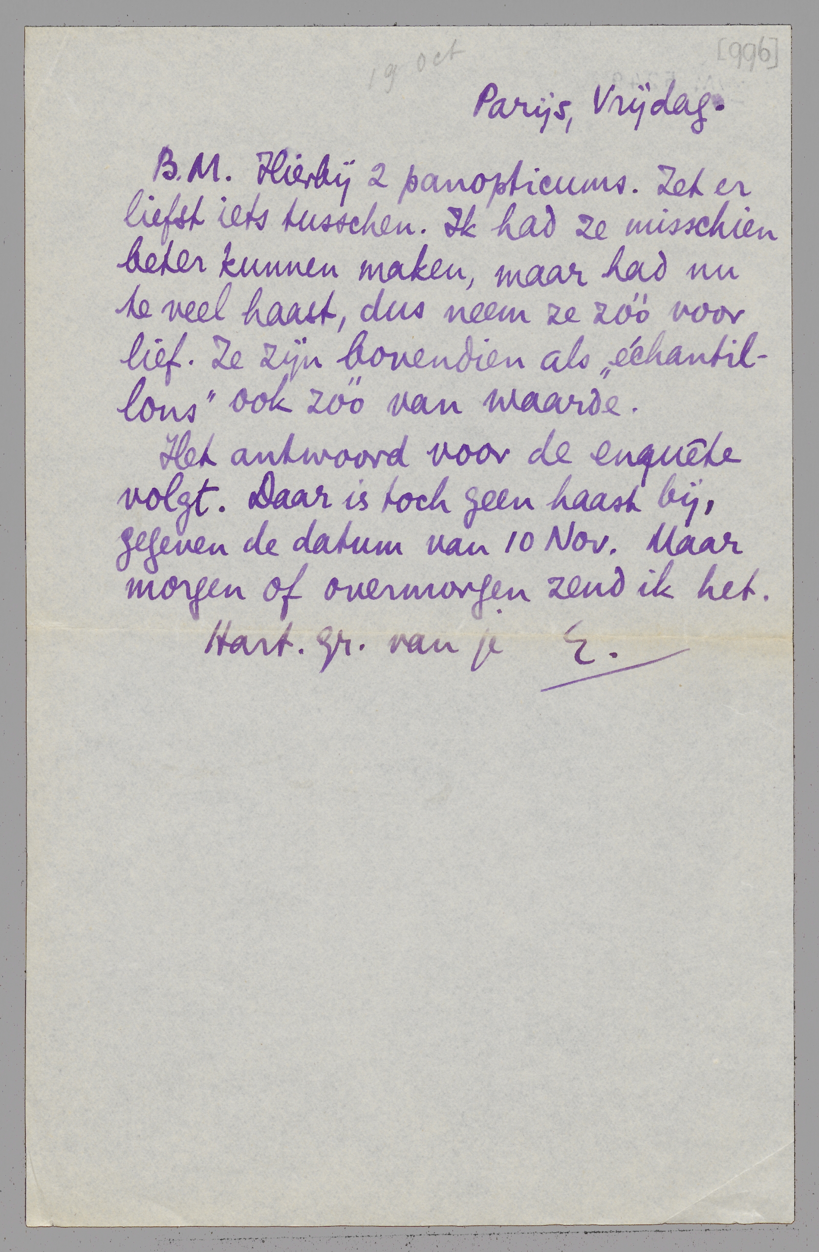 Hierbij 2 panopticums. Zet er liefst iets tusschen. Ik had ze misschien beter kunnen maken, maar had nu te veel haast, dus neem ze zóó voor lief. Ze zijn bovendien als ‘échantillons’ ook zóó van waarde.
