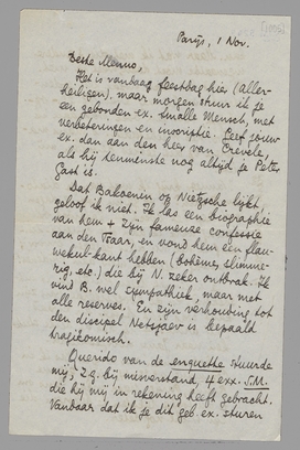 Het is vandaag feestdag hier (Allerheiligen), maar morgen stuur ik je een gebonden ex. Smalle Mensch, met verbeteringen en inscriptie. Geef jou ex. dan aan den heer van Crevele, als hij tenminste nog altijd je Peter Gast is.