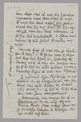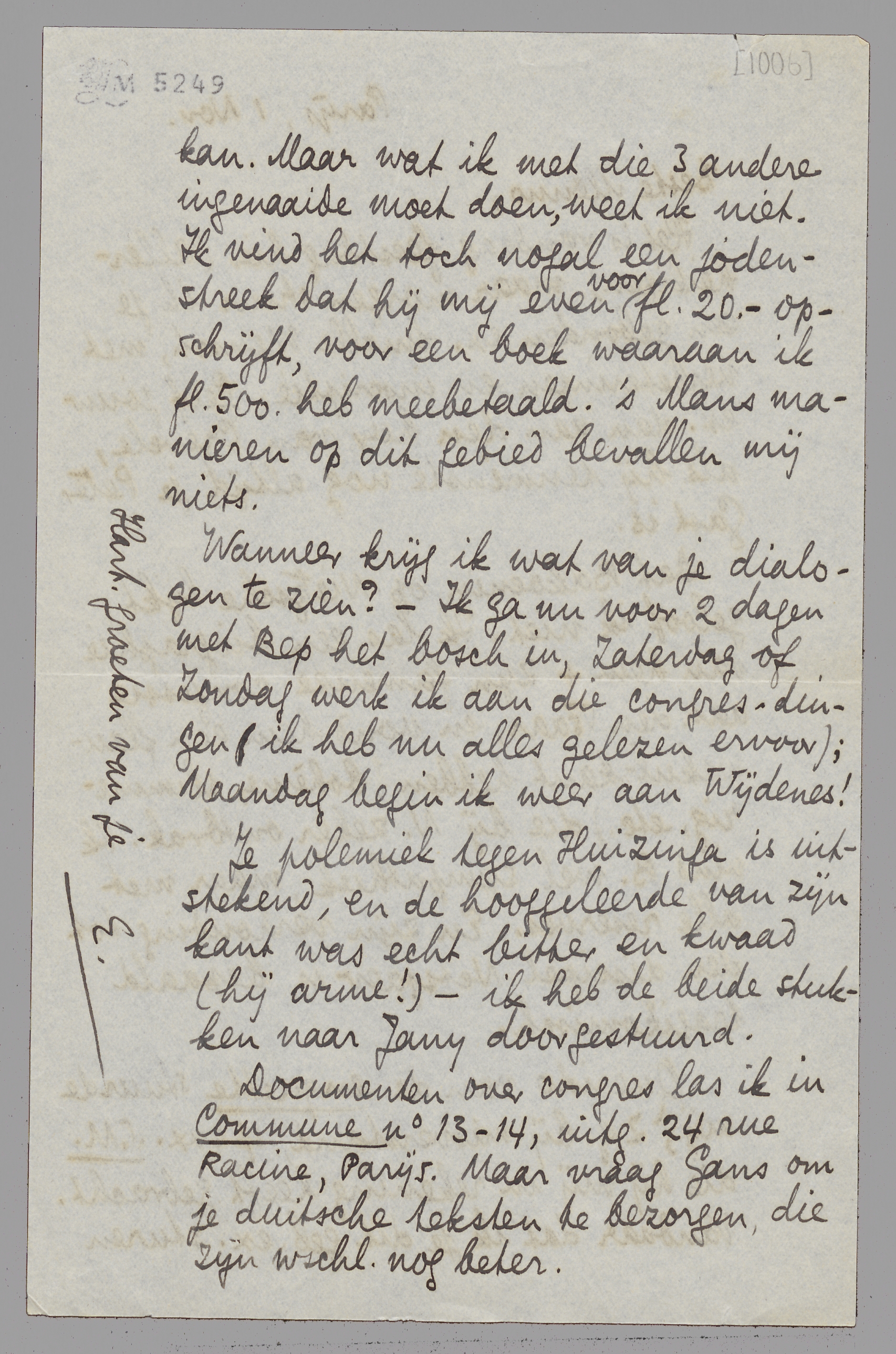Querido van de enquette stuurde mij, z.g. bij misverstand, 4 exx. S.M. die hij mij in rekening heeft gebracht. Vandaar dat ik je dit geb. ex. sturen kan. Maar wat ik met die 3 andere ingenaaide moet doen, weet ik niet. Ik vind het toch nogal een jodenstreek dat hij mij even voor fl. 20. - opschrijft, voor een boek waaraan ik fl. 500. - heb meebetaald. 's Mans manieren op dit gebied bevallen mij niets.