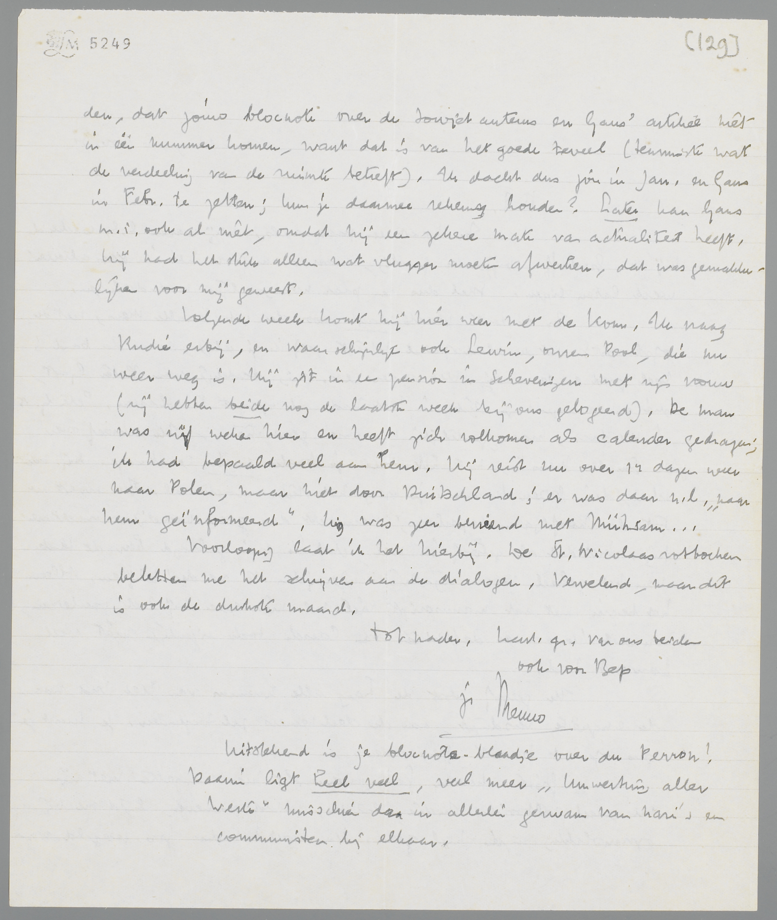 Gisteren kwam Gans onverwacht hier aanzetten met zijn nu geheel voltooide studie, 23 pag. dicht beschreven, lijkt me bij oppervlakkig inzien heel goed. Nu moet het dus zoo geregeld worden, dat jouw blocnote over de Sowjet auteurs en Gans' artikel niet in één nummer komen, want dat is van het goede teveel (tenminste wat de verdeeling van de ruimte betreft). Ik dacht dus jou in Jan. en Gans in Febr. te zetten; kun je daarmee rekening houden? Later kan Gans m.i. ook al niet, omdat hij een zekere mate van actualiteit heeft. Hij had het stuk alleen wat vlugger moeten afwerken, dat was gemakkelijker voor mij geweest.