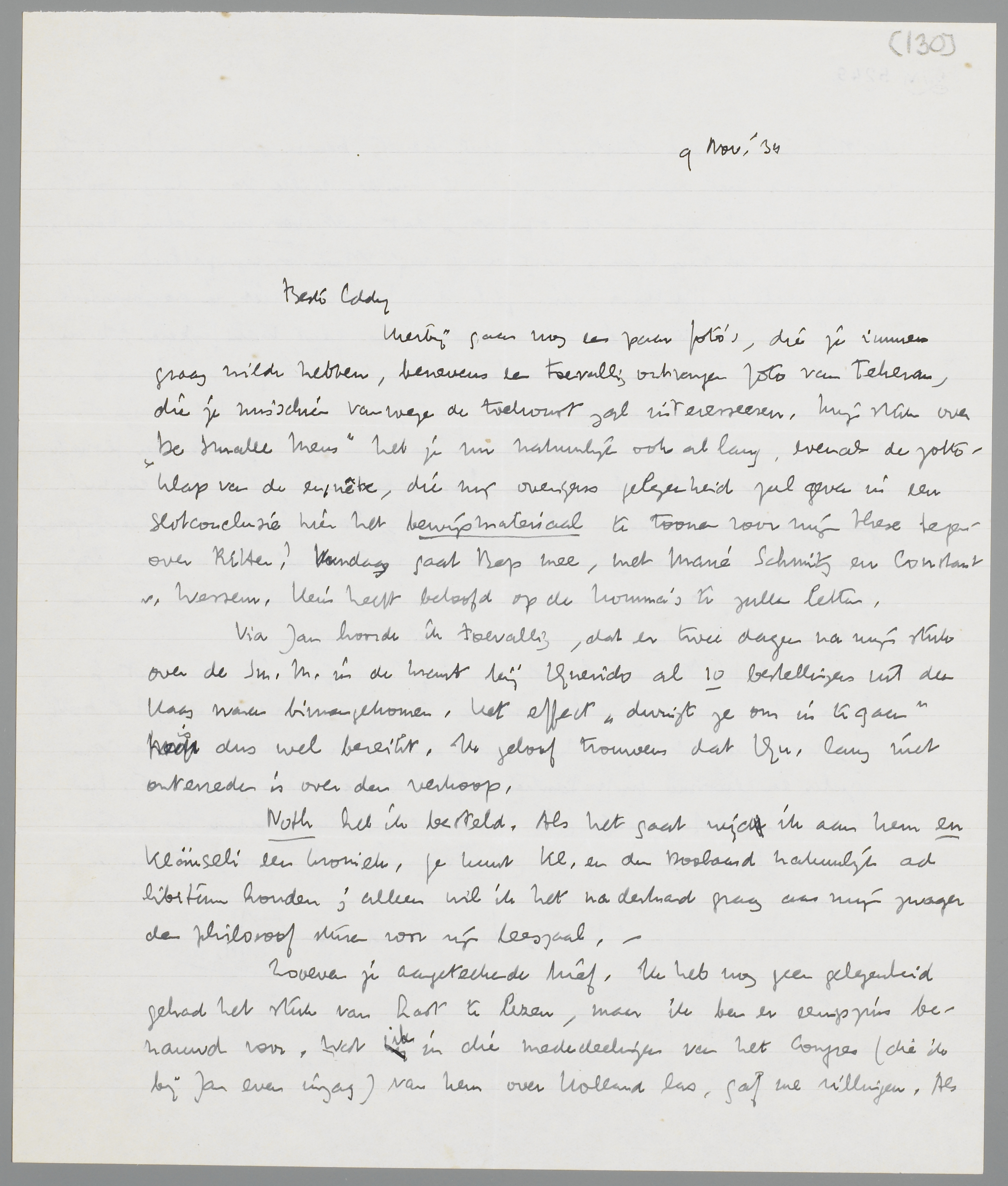 Hierbij gaan nog een paar foto's, die je immers graag wilde hebben, benevens een toevallig ontvangen foto van Teheran, die je misschien vanwege de toekomst zal interesseeren. Mijn stuk over De Smalle Mens heb je natuurlijk ook al lang, evenals de zotteklap van de enquête, die mij overigens gelegenheid zal geven in een slotconclusie hier het bewijsmateriaal te toonen voor mijn these tegenover Ritter! Vandaag gaat Bep mee, met Marie Schmitz en Constant v. Wessem. Hein heeft beloofd op de komma's te zullen letten.