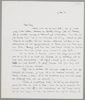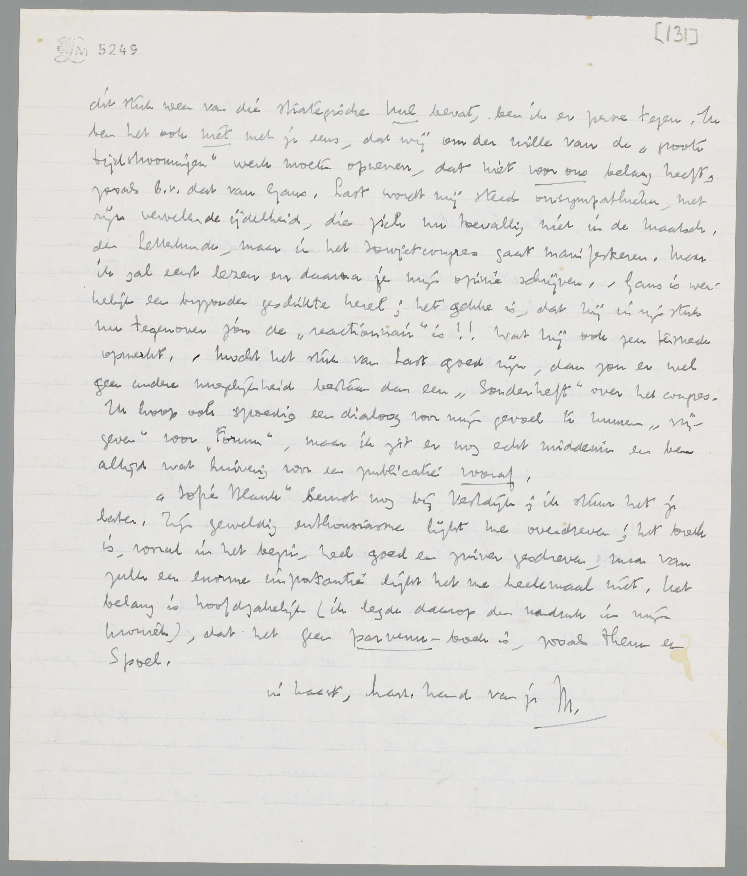 Zooeven je aangeteekende brief. Ik heb nog geen gelegenheid gehad het stuk van Last te lezen, maar ik ben er eenigszins benauwd voor. Wat ik in die mededeelingen van het Congres (die ik bij Jan even inzag) van hem over Holland las, gaf me rillingen. Als dit stuk weer van die strategische kul bevat, ben ik er perse tegen. Ik ben het ook niet met je eens, dat wij om der wille van de ‘groote tijdstroomingen’ werk moeten opnemen, dat niet voor ons belang heeft, zooals b.v. dat van Gans. Last wordt mij steeds onsympathieker, met zijn vervelende ijdelheid, die zich nu toevallig niet in de Maatsch. der Letterkunde, maar in het Sowjetcongres gaat manifesteren. Maar ik zal eerst lezen en daarna je mijn opinie schrijven. - Gans is werkelijk een bijzonder geschikte kerel; het gekke is, dat hij in zijn stuk nu tegenover jou de ‘reactionnair’ is!! Wat hij ook zeer tersnede opmerkt. - Mocht het stuk van Last goed zijn, dan zou er wel geen andere mogelijkheid bestaan dan een ‘Sonderheft’ over het congres. Ik hoop ook spoedig een dialoog voor mijn gevoel te kunnen ‘vrijgeven’ voor Forum, maar ik zit er nog echt middenin en ben altijd wat huiverig voor een publicatie vooraf.