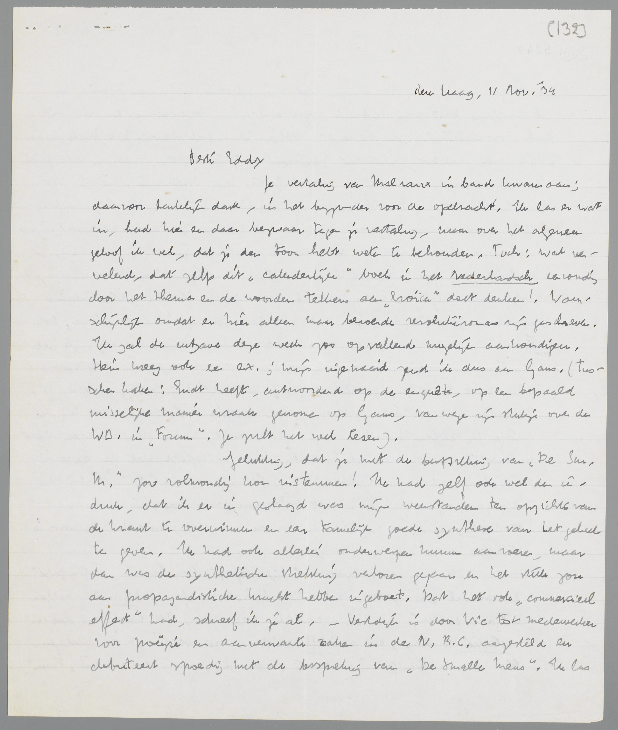 Gelukkig, dat je met de bespreking van De Sm. M. zoo volmondig kon instemmen! Ik had zelf ook wel den indruk, dat ik er in geslaagd was mijn weerstanden ten opzichte van de krant te overwinnen en een tamelijk goede synthese van het geheel te geven. Ik had ook allerlei onderwerpen kunnen aanroeren, maar dan was de synthetische strekking verloren gegaan en het stuk zou aan propagandistische kracht hebben ingeboet. Dat het ook ‘commercieel effect’ had, schreef ik je al. - Vestdijk is door Vic tot medewerker voor poëzie en aanverwante zaken in de N.R.C. aangesteld en debuteert spoedig met de bespreking van De Smalle Mens. Ik las het stuk, dat hij mij vanmorgen liet zien. Het is m.i. weer typisch de scholastische kant van Vestdijk, zonder eigenlijke overtuiging en au fond toch specialistisch-gereserveerd. Volgens hem culmineert het boek in het stuk over Hamlet, wat mij pertinent onjuist lijkt. Maar in ieder geval is zijn bespreking beter dan een ev. lulstuk van Anthonie, die in het laatste Bulletin De Slinger van den Tijd, een infaam prul, verheerlijkt. Godgeklaagd gewoonweg; ik heb het in Het Vad. vermoord. (Het is overigens al uitverkocht, vanwege de zedelooze passages denk ik). - De brief van Joost Enquette is vuil. Ik begin hoewel geheel ongemotiveerd, Zijlstra weer meer te waardeeren. Van dergelijke kleine koopmanspractijken heb ik met hem tenminste nooit last gehad; ook Forum pakt hij voor 1935 weer royaal aan. Maar dit nog: ik heb van Querido nooit een berekening van de kosten ontvangen en ben dus juridisch niet te vangen, gesteld dat hij mij oplichten wil, in Nov. '35. Ik vertrouw hem niet erg meer, dezen kleinen zakenman. Dat hij de eindjes bij elkaar houdt is zijn goed recht, maar deze wegerij riekt bedenkelijk naar een anaal karakter. De gierigheid met de recensie-exemplaren wijst ook in die richting. Ik kan momenteel niet bij Hein navragen, of hij zijn ex. heeft ontvangen (voor zoover ik weet kreeg hij het niet, want ik gaf hem dat van de krant), want mijn telefoon is stuk en ik zie hem pas morgen.