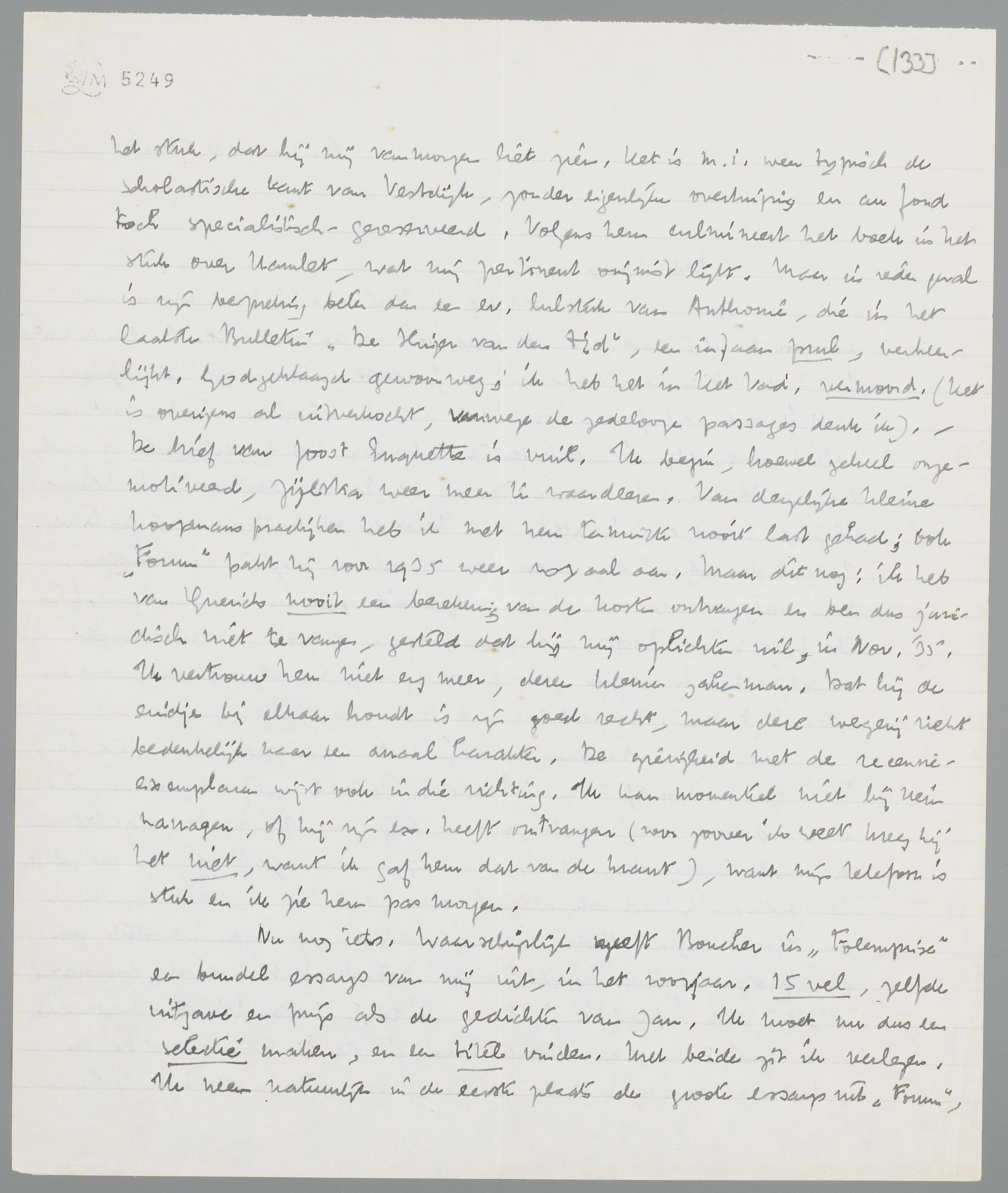 Nu nog iets. Waarschijnlijk geeft Boucher in Folemprise een bundel essays van mij uit, in het voorjaar. 15 vel, zelfde uitgave en prijs als de gedichten van Jan. Ik moet nu dus een selectie maken, en een titel vinden. Met beide zit ik verlegen. Ik neem natuurlijk in de eerste plaats de groote essays uit Forum, dan het stuk uit Die Sammlung, Dionysos en Pentheus uit De Gids. Maar verder? Panoptica? Welke? Hier wil ik streng schiften. En dan rest nog wat ik in de N.R.C. en Het Vad. heb geschreven, waarvoor de selectie natuurlijk nog tienmaal strenger moet zijn. Nu wou ik je dit vragen: zou je mij een lijstje willen sturen, geverifieerd aan de Forumjaargangen en je geheugen, waarop de stof, die volgens jou in aanmerking komt? En - als je een idee hebt - een titel! Ik heb gedacht aan Studies in Schaduw, maar dat is me te aesthetisch. Bij voorbaat dank! Het kan, dunkt mij, een heel aardig boek worden, maar de selectie moet goed zijn; en denk ook aan de 240 pagina's maximum.