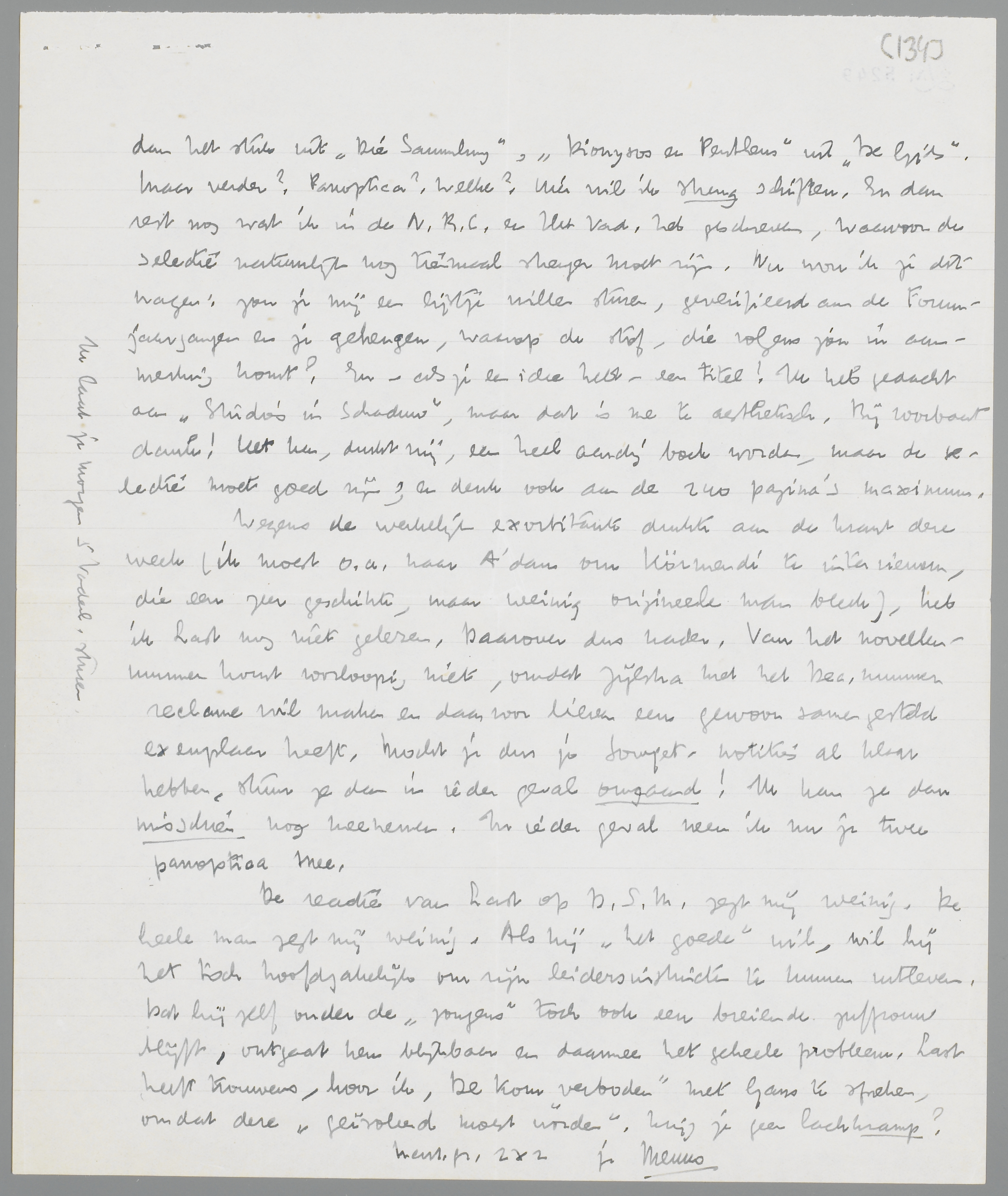 Wegens de werkelijk exorbitante drukte aan de krant deze week (ik moest o.a. naar A'dam om Körmendi te interviewen, die een zeer geschikte, maar weinig origineele man bleek), heb ik Last nog niet gelezen. Daarover dus nader. Van het novellennummer komt voorloopig niets, omdat Zijlstra met het Dec. nummer reclame wil maken en daarvoor liever een gewoon samengesteld exemplaar heeft. Mocht je dus je Sowjet-notities al klaar hebben, stuur ze dan in ieder geval omgaand! Ik kan ze dan misschien nog meenemen. In ieder geval neem ik nu je twee panoptica mee.