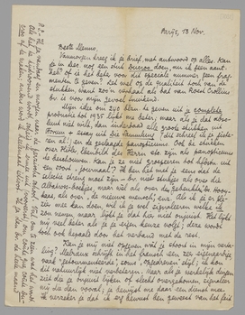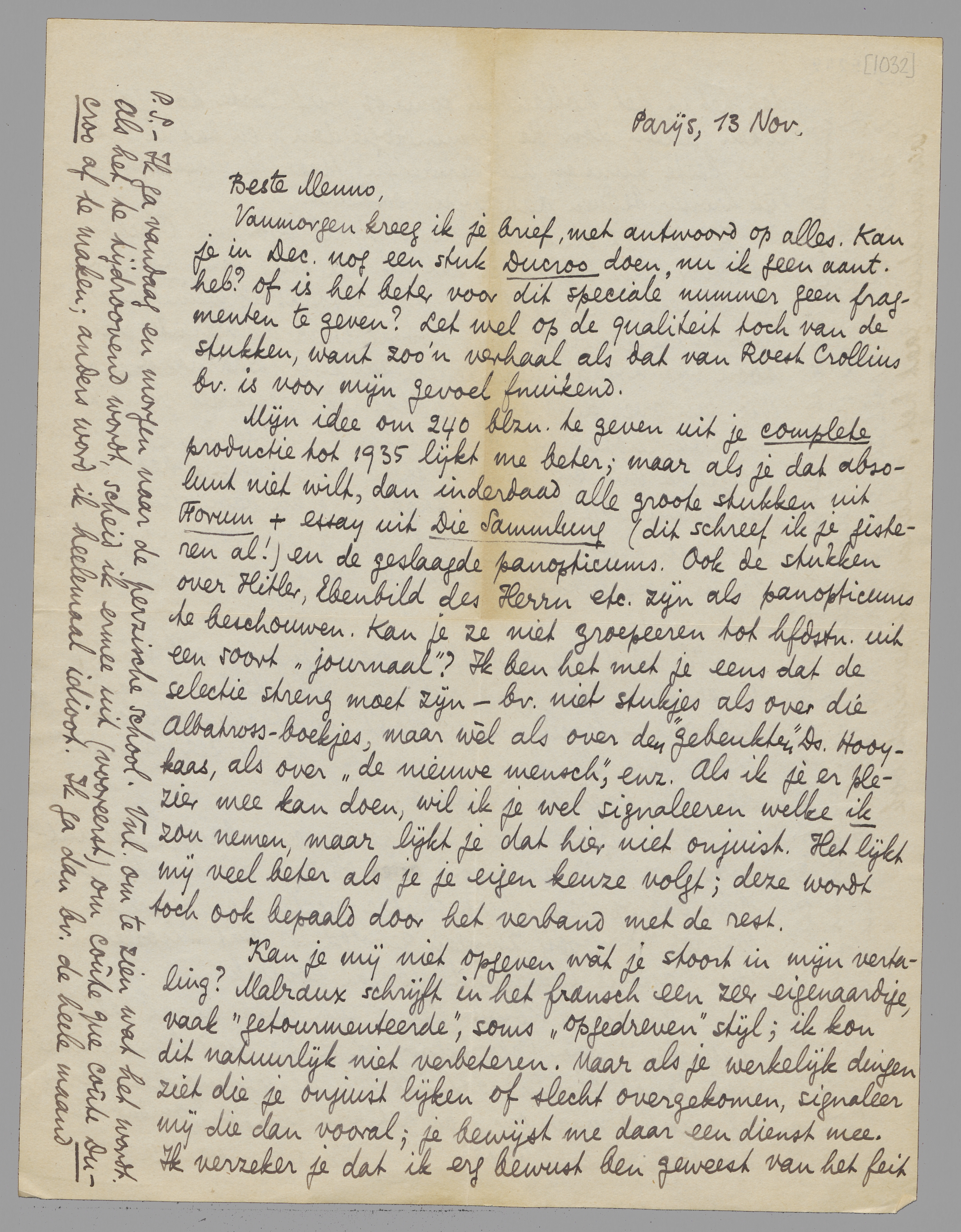 P.S. - Ik ga vandaag en morgen naar de perzische school. Vnl. om te zien wat het wordt. Als het te tijdroovend wordt, scheid ik ermee uit (vooreerst) om coûte que coûte Ducroo af te maken; anders word ik heelemaal idioot. Ik ga dan bv. de heele maand December in de afzondering zitten in St. Brieuc en hoop er dan vrijwel mee klaar te zijn. Hier in Parijs word ik door allerlei dingen afgeleid en gestoord; Parijs is te boeiend, ik heb nooit zoo goed gewerkt hier als in Bellevue en Bretagne. Dus... Maar misschien gaat het, ondanks het perzisch, ook.