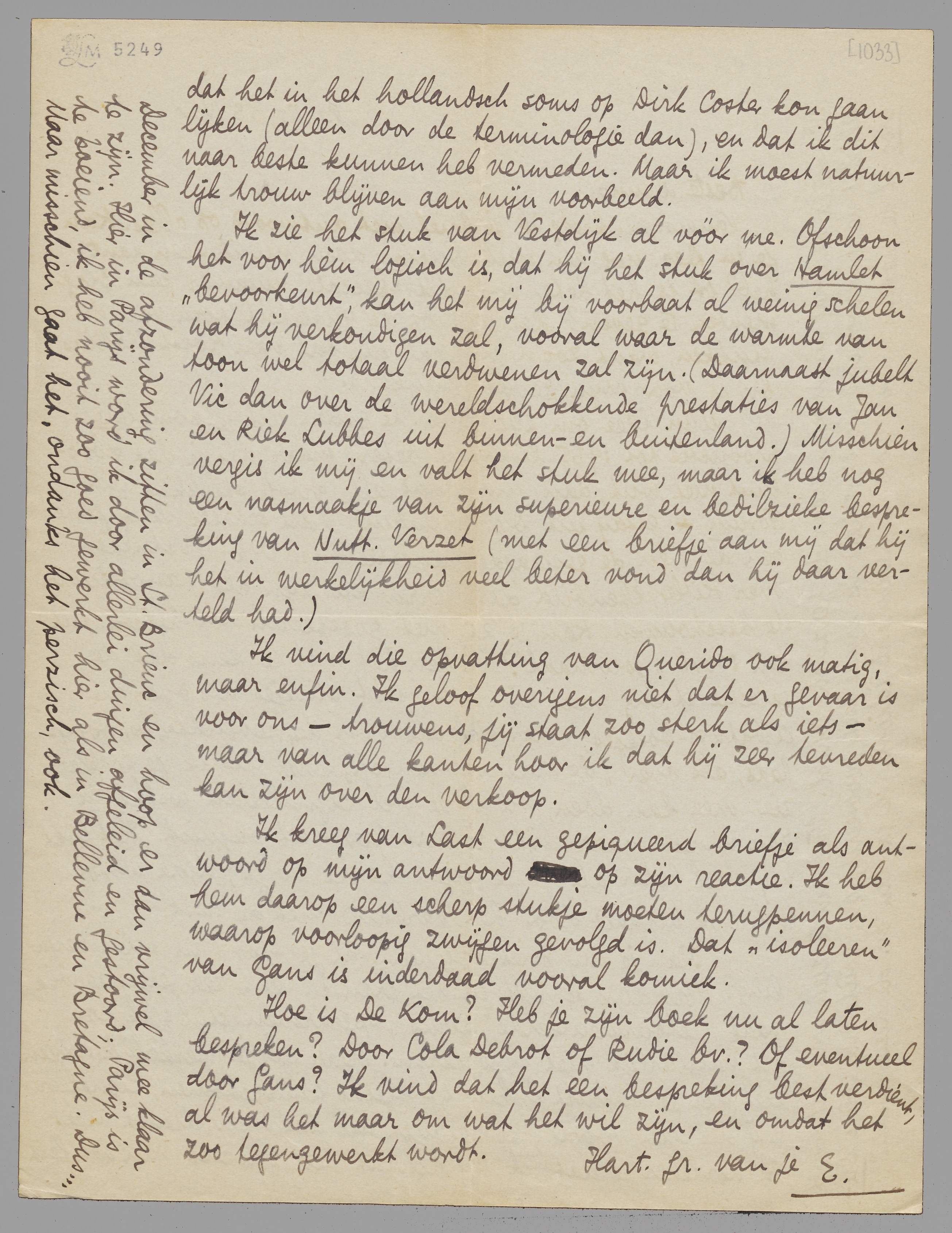 Ik vind die opvatting van Querido ook matig, maar enfin. Ik geloof overigens niet dat er gevaar is voor ons - trouwens, jij staat zoo sterk als iets - maar van alle kanten hoor ik dat hij zeer tevreden kan zijn over den verkoop.