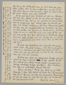 Kan je mij niet opgeven wàt je stoort in mijn vertaling? Malraux schrijft in het fransch een zeer eigenaardige, vaak ‘getourmenteerde’, soms ‘opgedreven’ stijl; ik kon dit natuurlijk niet verbeteren. Maar als je werkelijk dingen ziet die je onjuist lijken of slecht overgekomen, signaleer mij die dan vooral; je bewijst me daar een dienst mee. Ik verzeker je dat ik erg bewust ben geweest van het feit dat het in het Hollandsch soms op Dirk Coster kon gaan lijken (alleen door de terminologie dan), en dat ik dit naar beste kunnen heb vermeden. Maar ik moest natuurlijk trouw blijven aan mijn voorbeeld.