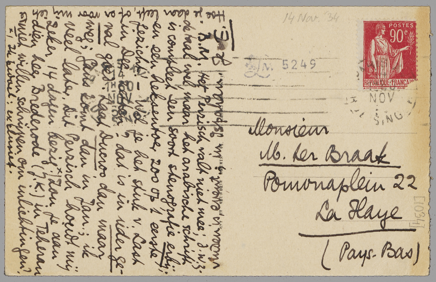 Het Perzisch valt niet mee; d.w.z. de taal wel, maar het arabische schrift is compleet een soort stenografie erbij; en een heksentoer zoo op 't eerste gezicht. - Wil je het stuk van Last in Dec. zetten? dat is in ieder geval goed. Laat Ducroo dan maar weg; Gans komt dan in Jan.; ik veel later. Dit Perzisch houdt mij zeker 14 dagen bezig. [Ik bedoel: exclusief.] Zou je aan dien heer Brederode (J.K.) in Teheran niet willen schrijven om inlichtingen? Hoe je daar leeft, of er voor mij iets te vinden is, event. in Ispahan.