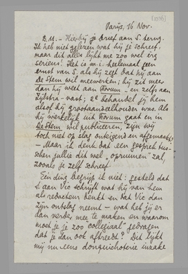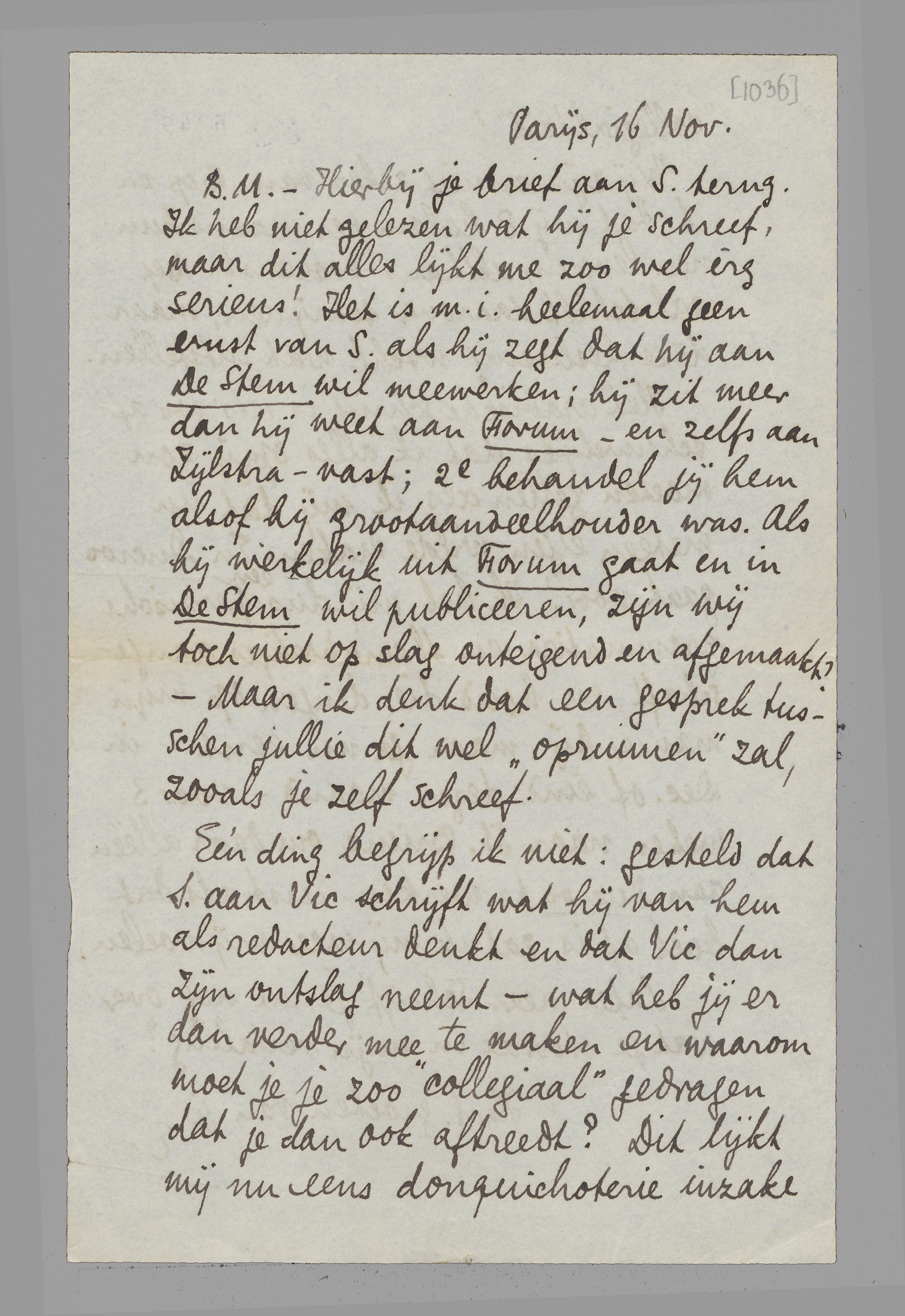- Hierbij je brief aan S. terug. Ik heb niet gelezen wat hij je schreef, maar dit alles lijkt me zoo wel èrg serieus! Het is m.i. heelemaal geen ernst van S. als hij zegt dat hij aan De Stem wil meewerken; hij zit meer dan hij weet aan Forum - en zelfs aan Zijlstra - vast; 2e behandel jij hem alsof hij grootaandeelhouder was. Als hij wèrkelijk uit Forum gaat en in De Stem wil publiceeren, zijn wij toch niet op slag onteigend en afgemaakt? - Maar ik denk dat een gesprek tusschen jullie dit wel ‘opruimen’ zal, zooals je zelf schreef.