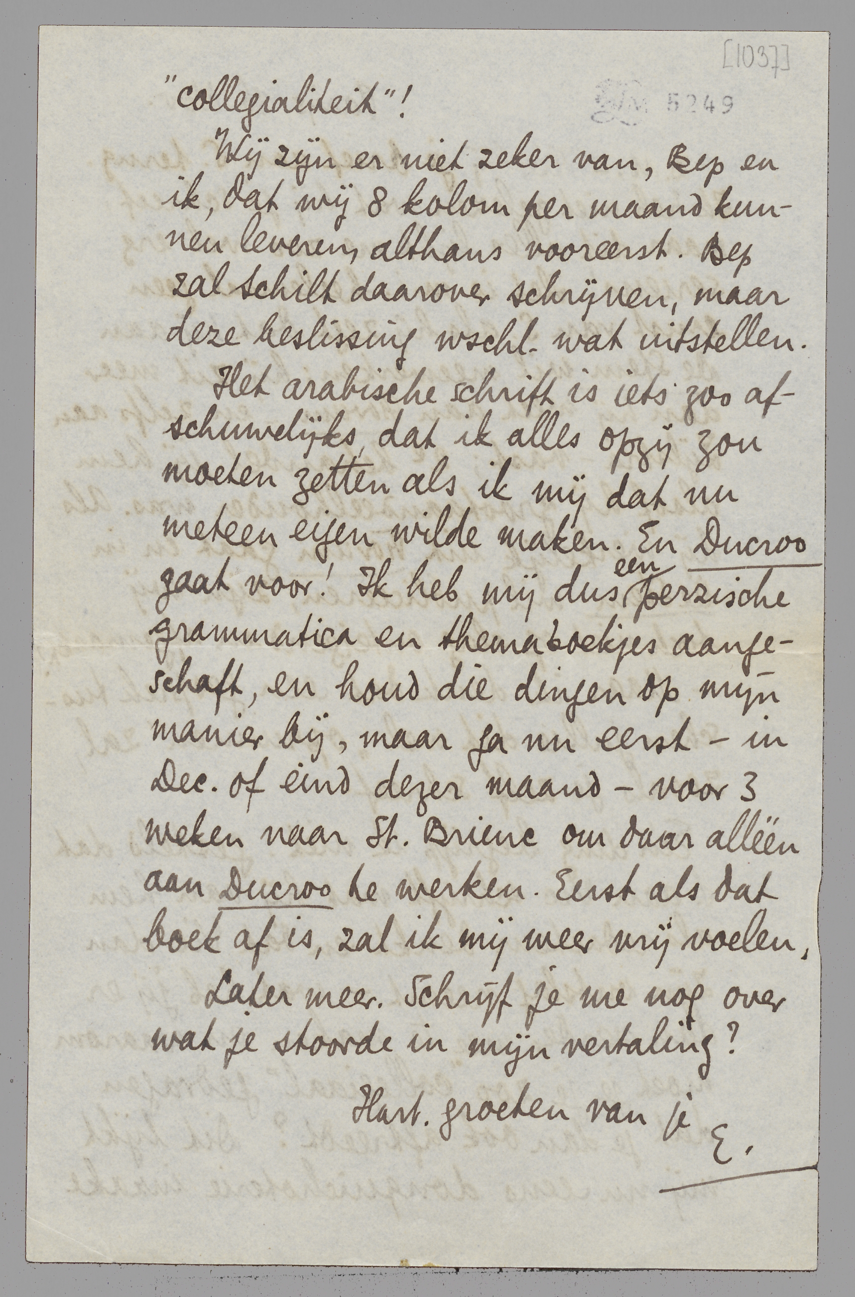 Het arabische schrift is iets zoo afschuwelijks, dat ik alles opzij zou moeten zetten als ik mij dat nu meteen eigen wilde maken. En Ducroo gaat voor! Ik heb mij dus een perzische grammatica en themaboekjes aangeschaft, en houd die dingen op mijn manier bij, maar ga nu eerst - in Dec. of eind dezer maand - voor 3 weken naar St. Brieuc om daar alléén aan Ducroo te werken. Eerst als dat boek af is, zal ik mij weer vrij voelen.