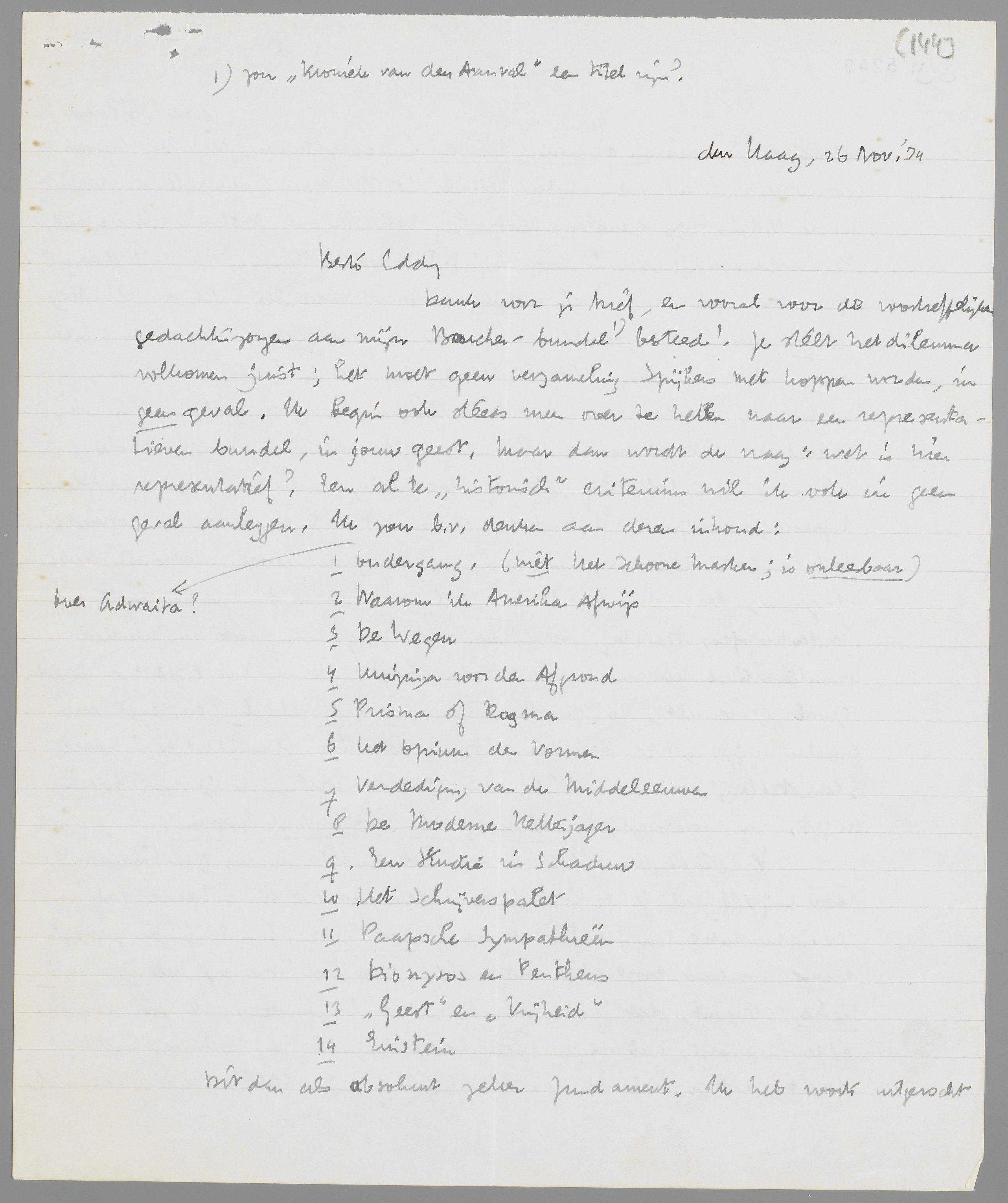 Dit dan als absoluut zeker fundament. Ik heb voorts uitgezocht allerlei dingen, die in aanmerking komen: panopticums en kleinere stukken uit Forum, Naar een Concertgebouw v.d. Filmkunst (afscheidsartikel uit Filmliga), verschillende stukken uit de N.R.C. over Spengler, Nietzsche, het stuk over Anthonie uit de V.Bl. De hoofdmoeilijkheid is voor mij: het panopticum. Ik wil daaruit bij nader inzien maar heel weinig nemen; maar ik vind de schifting uiterst moeilijk. Zoo bladerend zou ik b.v. wel willen nemen: Eckermann met Eckermann, Hitler Ebenbild, Psychologie van de caricatuur, Mysterie v. Leidschendam, Horst Wichmann, maar niet: Prijs vh. Bloemlezen, Wassermann en Sammlung, Moralisten als Don Quichotes, Links gerichte Collectief, Braaf, Goedaardig en Weerloos, de Oud-Helden, Tyranny verdrijven, Dubrovnic etc. Dit zijn maar enkele voorbeelden. Het is natuurlijk mogelijk om, na eerst de groote stukken te hebben gegeven, deze dingen als journaal aan elkaar te werken met onderkopjes. Daarbij zouden dan ook fragmenten uit een enkel krantenartikel kunnen worden ondergebracht. Maar het lijkt me in ieder geval gewenscht, de groote stukken in hun geheel (ev. met een enkele wijziging) te drukken en te herdrukken. Gemakkelijk is deze samenstellerij nog lang niet! Schrijf me vooral, als je nog ideeën krijgt. En vooropgesteld: in geen geval Spijkers met koppen!