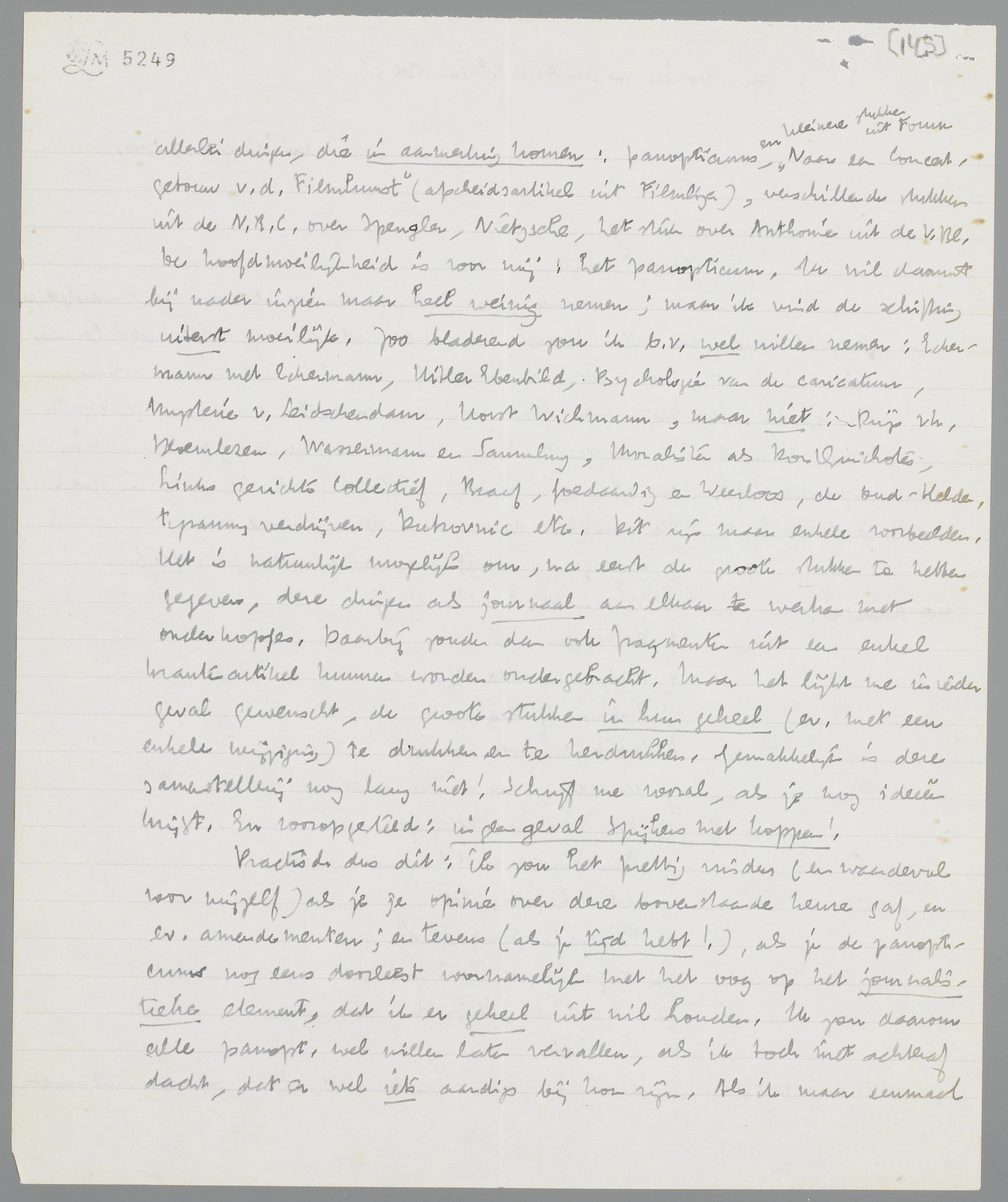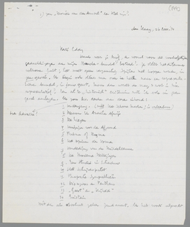 Practisch dus dit: ik zou het prettig vinden (en waardevol voor mijzelf) als je je opinie over deze bovenstaande keuze gaf, en ev. amendementen; en tevens (als je tijd hebt!), als je de panopticums nog eens doorleest voornamelijk met het oog op het journalistieke element, dat ik er geheel uit wil houden. Ik zou daarom alle panopt. wel willen laten vervallen, als ik toch niet achteraf dacht, dat er wel iets aardigs bij kon zijn. Als ik maar eenmaal het juiste principe heb, heb ik er graag wat moeite voor over om het ‘journaal’ samen te stellen! Natuurlijk moet ik ook rekening houden met de 15 vel, waarvan dan nog een paar pagina's voor een bibliographie afgaan. -