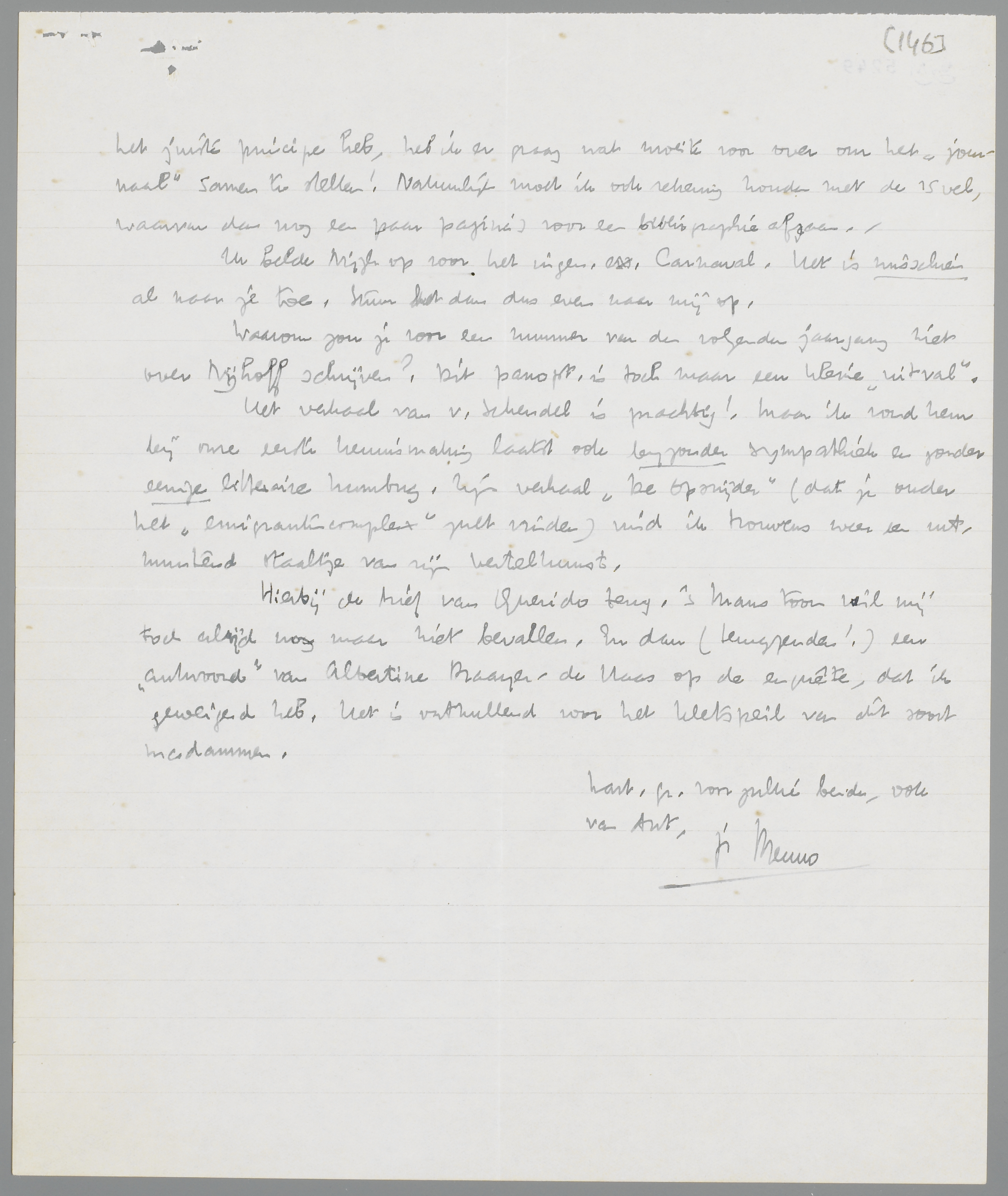 Dank voor je brief, en vooral voor de voortreffelijke gedachtenzorgen aan mijn Boucher-bundel [zou Kroniek van den Aanval een titel zijn?] besteed! Je stelt het dilemma volkomen juist; het moet geen verzameling Spijkers met koppen worden, in geen geval. Ik begin ook steeds meer over te hellen naar een representatieven bundel, in jouw geest. Maar dan wordt de vraag: wat is hier representatief? Een al te ‘historisch’ criterium wil ik ook in geen geval aanleggen. Ik zou b.v. denken aan dezen inhoud: