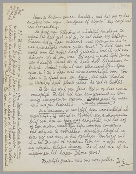 De brief van Albertine is wèrkelijk touchant. Ze meent het héél goed met je; ze zal zeker erg lief zijn. Waarom heb je haar antwoord niet opgenomen en er wat vriendelijke ironie onder gezet? Je hebt haar nu wschl. voor het grijze hoofd gestooten; wat ik niet zou kùnnen, als ik jou was. Het arme mensch lijdt gewoon aan hetzelfde euvel als de heele holl. literatuur en kritiek: totaal onbenul van planverschillen. Que veux-tu? zij is daar niet verantwoordelijk voor. Voor haar is Jo IJssel enz. een begin, dat vóór Elsschot en Walschap heeft plaats gehad. De rest is liefheid.