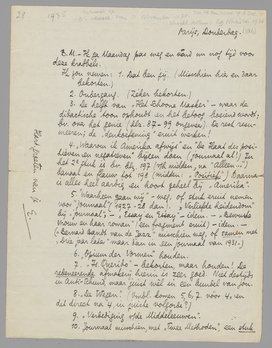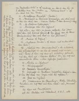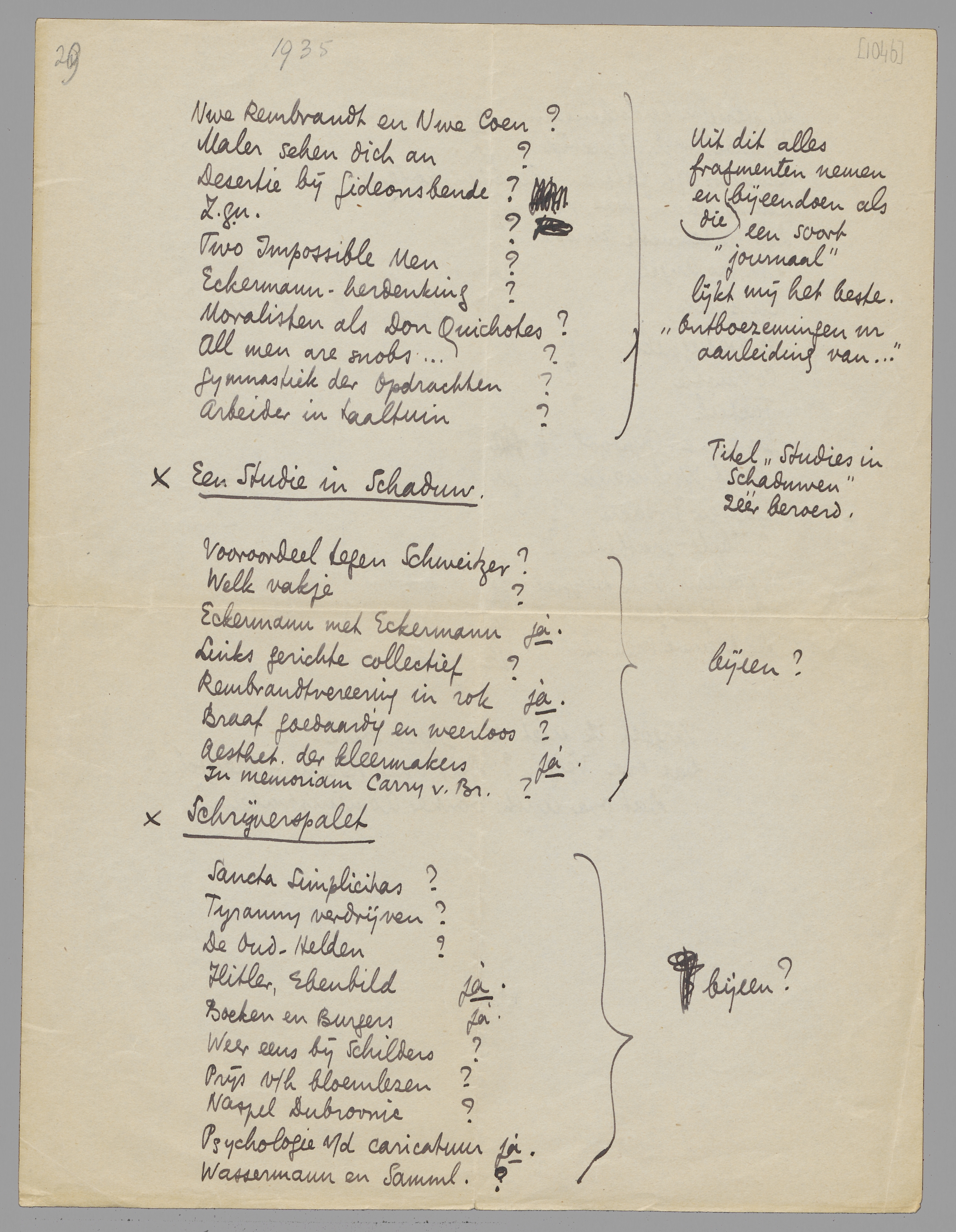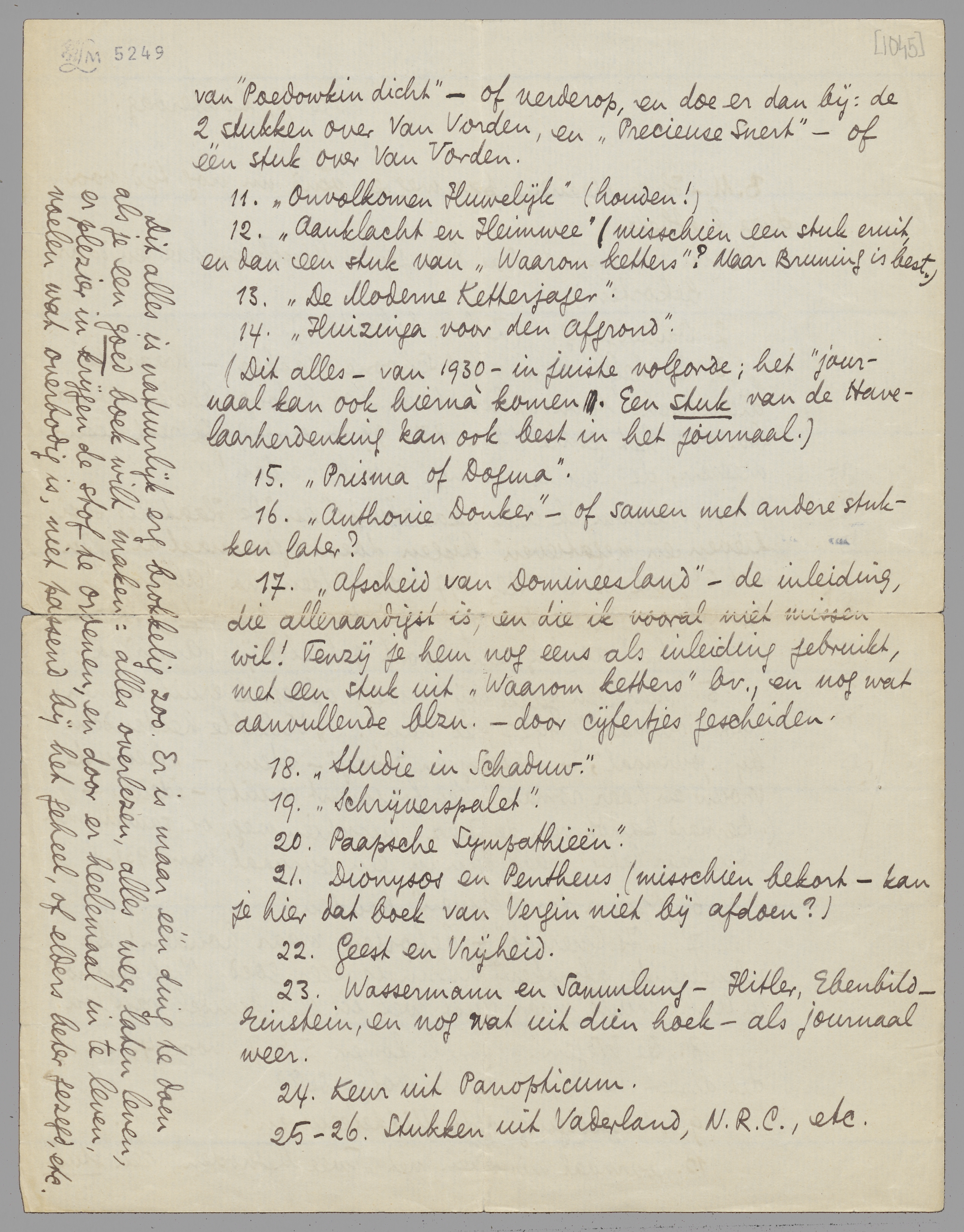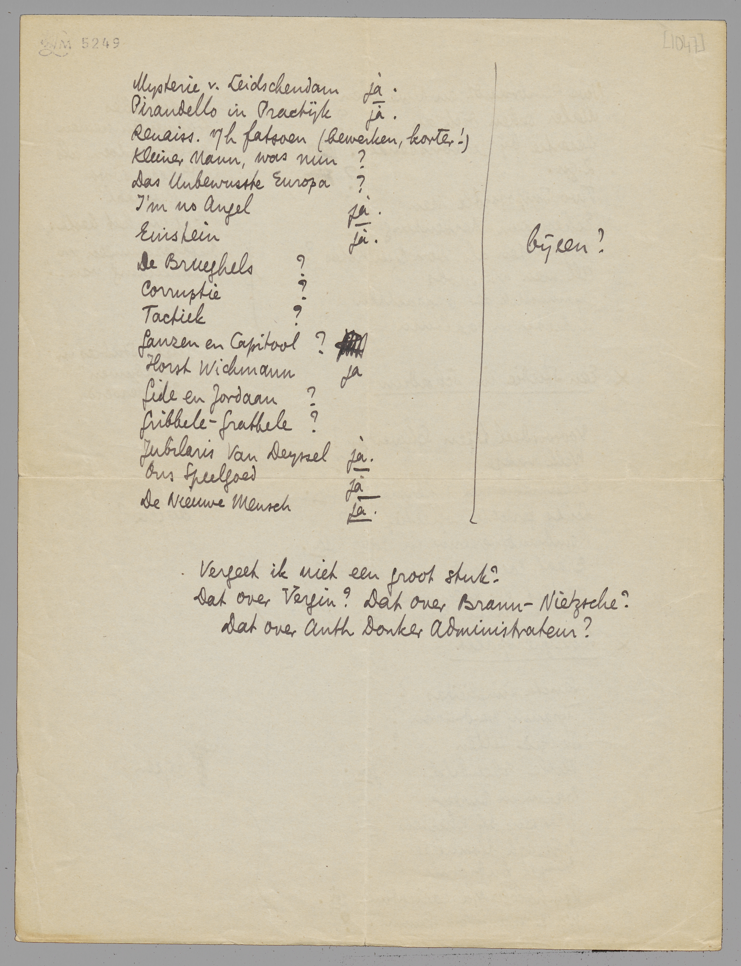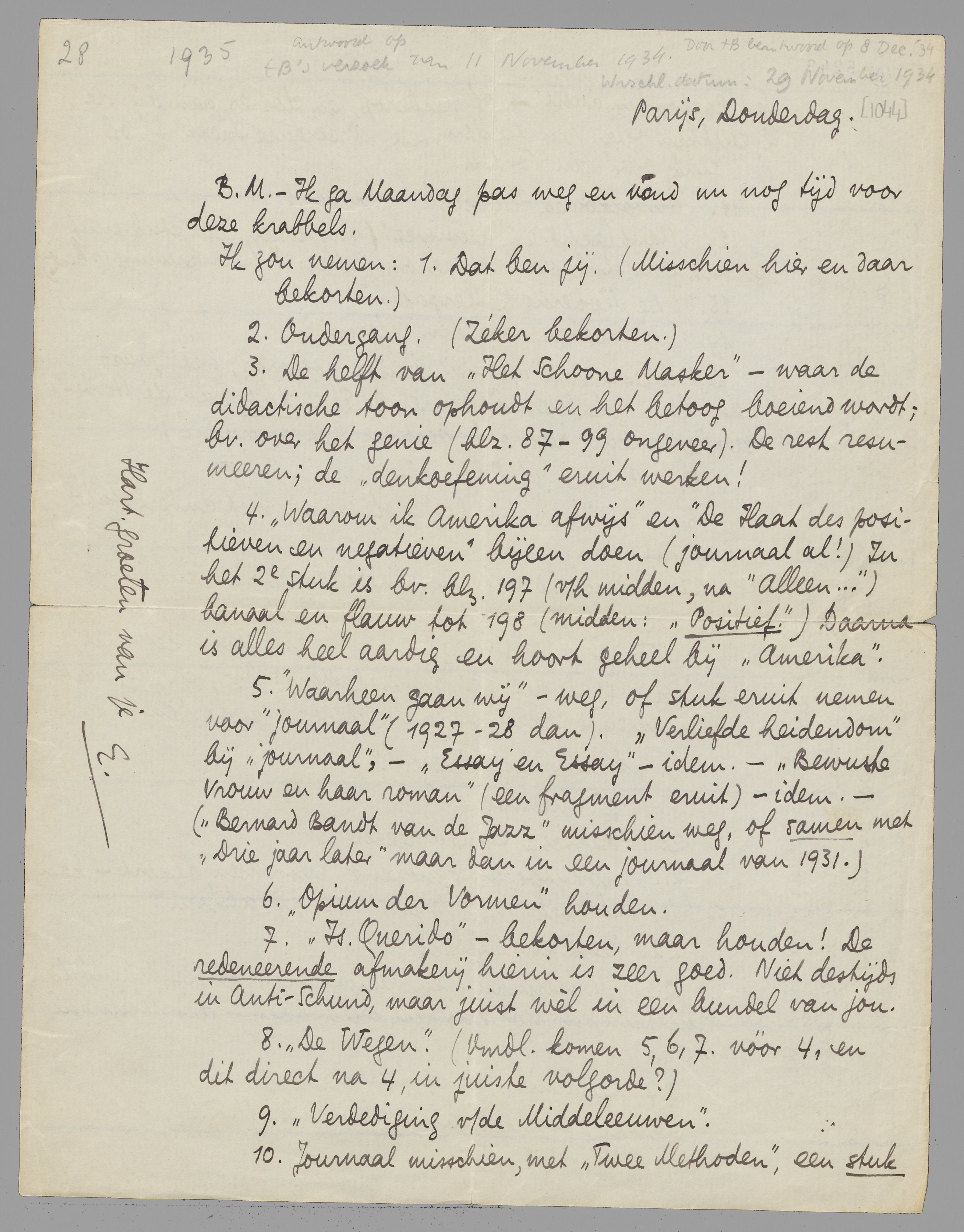 | 5. | Waarheen gaan wij - weg, of stuk eruit nemen voor ‘journaal’ (1927-28 dan). Verliefde heidendom bij ‘journaal’, -Essay en Essay -idem-Bewuste Vrouw en haar roman (een fragment eruit) - idem -(Bernard Bandt van de Jazz misschien weg, of samen met Drie jaar later maar dan in een journaal van 1931.) |