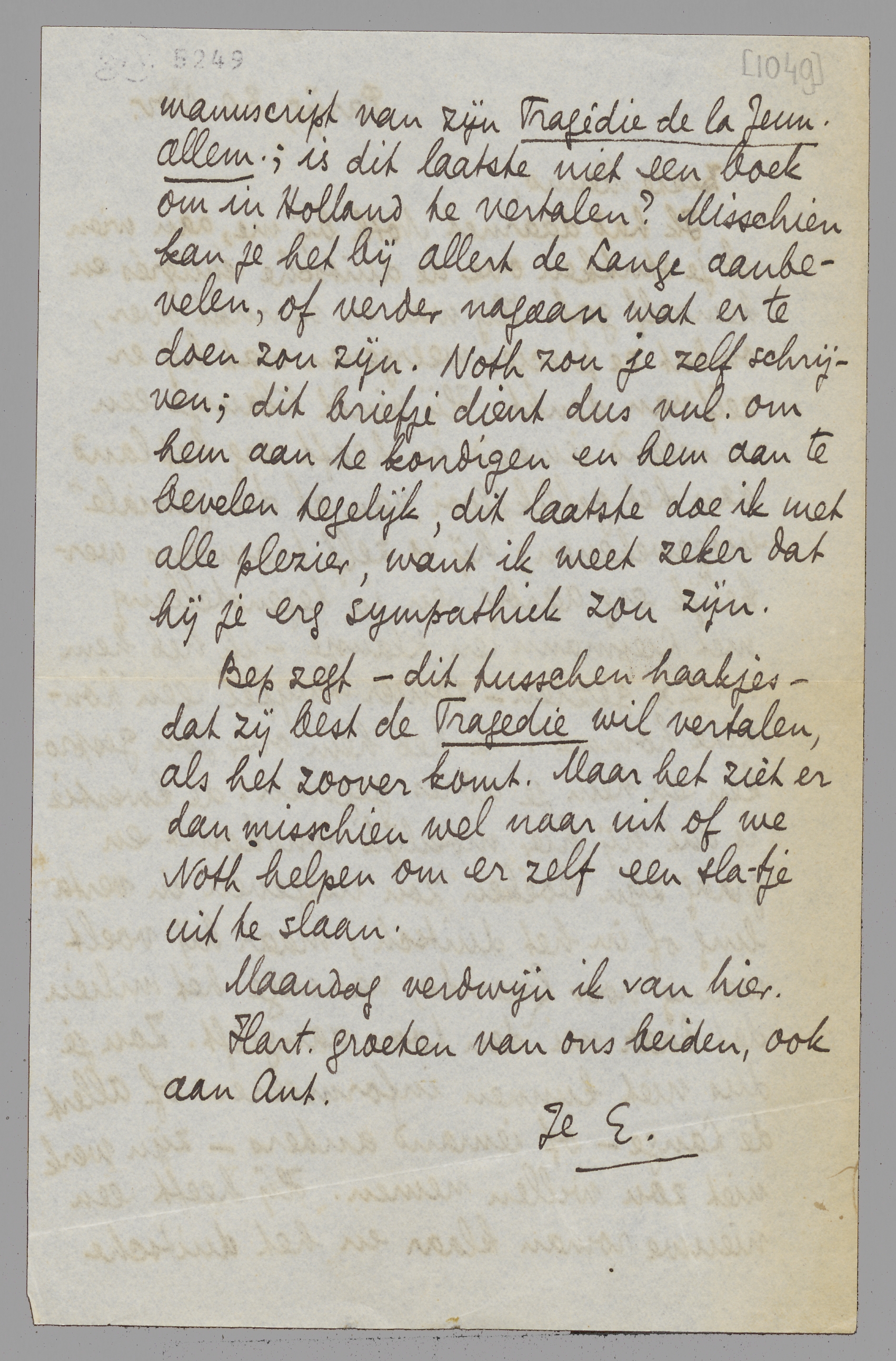 Bep zegt - dit tusschen haakjes - dat zij best de Tragedie wil vertalen, als het zoover komt. Maar het ziet er dan misschien wel naar uit of we Noth helpen om er zelf een sla-tje uit te slaan.