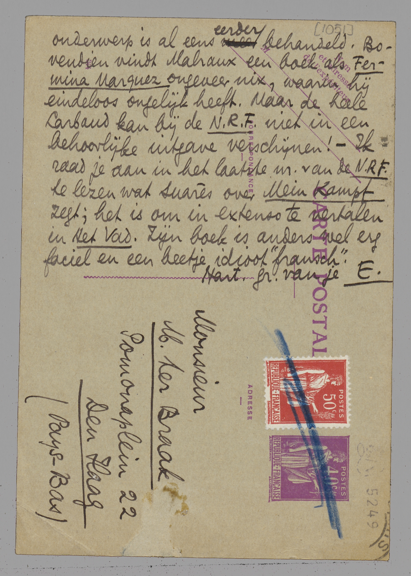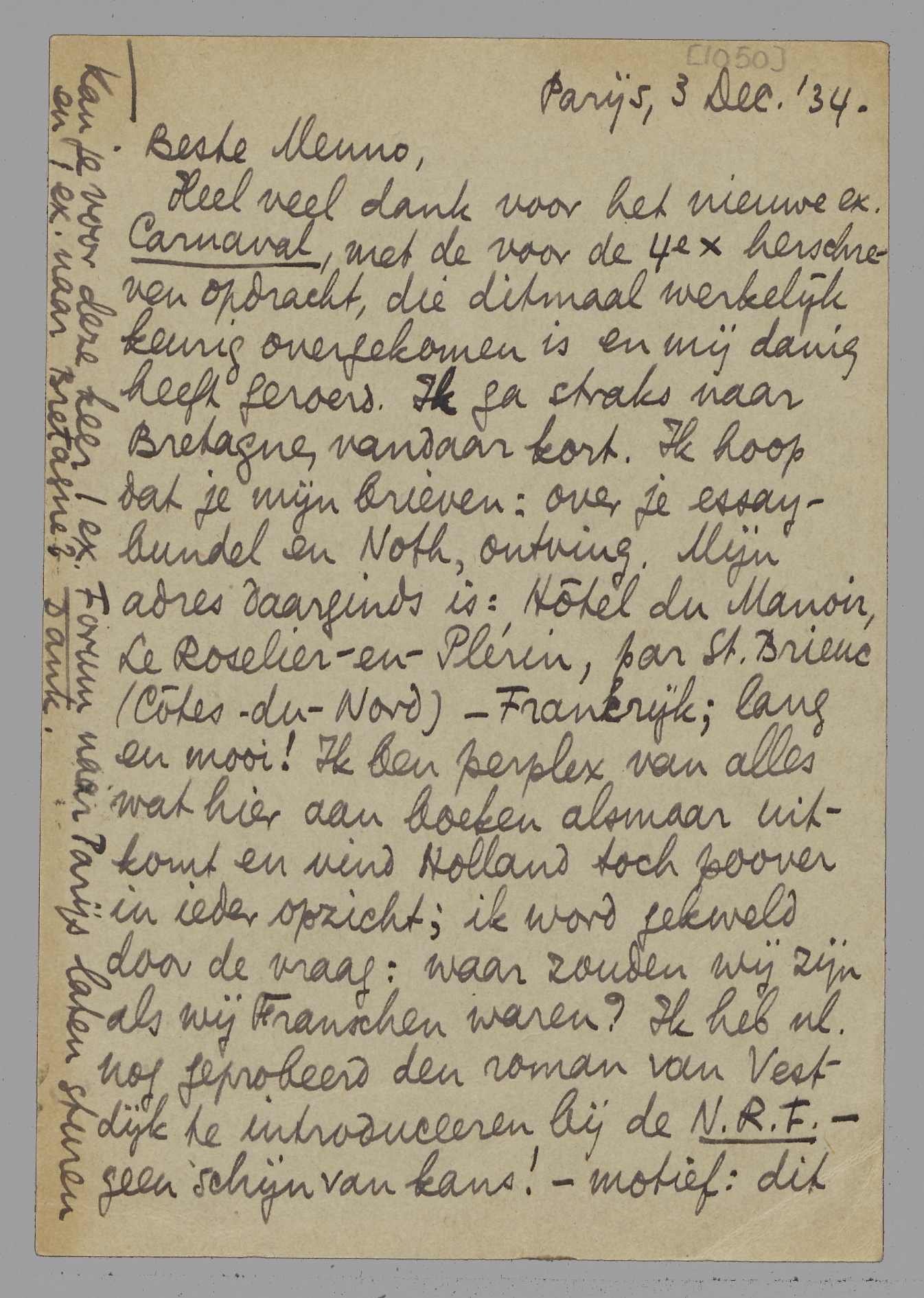 Heel veel dank voor het nieuwe ex. Carnaval, met de voor de 4e × herschreven opdracht, die ditmaal werkelijk keurig overgekomen is en mij danig heeft geroerd. Ik ga straks naar Bretagne, vandaar kort. Ik hoop dat je mijn brieven: over je essaybundel en Noth, ontving. Mijn adres daarginds is: Hôtel du Manoir, Le Roselier-en-Plérin, par St. Brieuc (Côtes-du-Nord)-Frankrijk; lang en mooi! Ik ben perplex van alles wat hier aan boeken alsmaar uitkomt en vind Holland toch poover in ieder opzicht; ik word gekweld door de vraag: waar zouden wij zijn als wij Franschen waren? Ik heb nl. nog geprobeerd den roman van Vestdijk te introduceeren bij de N.R.F. - geen schijn van kans! - motief: dit onderwerp is al eens eerder behandeld. Bovendien vindt Malraux een boek als Fermina Marquez ongeveer nix, waarin hij eindeloos ongelijk heeft. Maar de heele Larbaud kan bij de N.R.F. niet in een behoorlijke uitgave verschijnen! - Ik raad je aan in het laatste nr. van de N.R.F. te lezen wat Suarès over Mein Kampf zegt; het is om in extenso te vertalen in Het Vad. Zijn boek is anders wel erg faciel en een beetje idioot ‘fransch’.