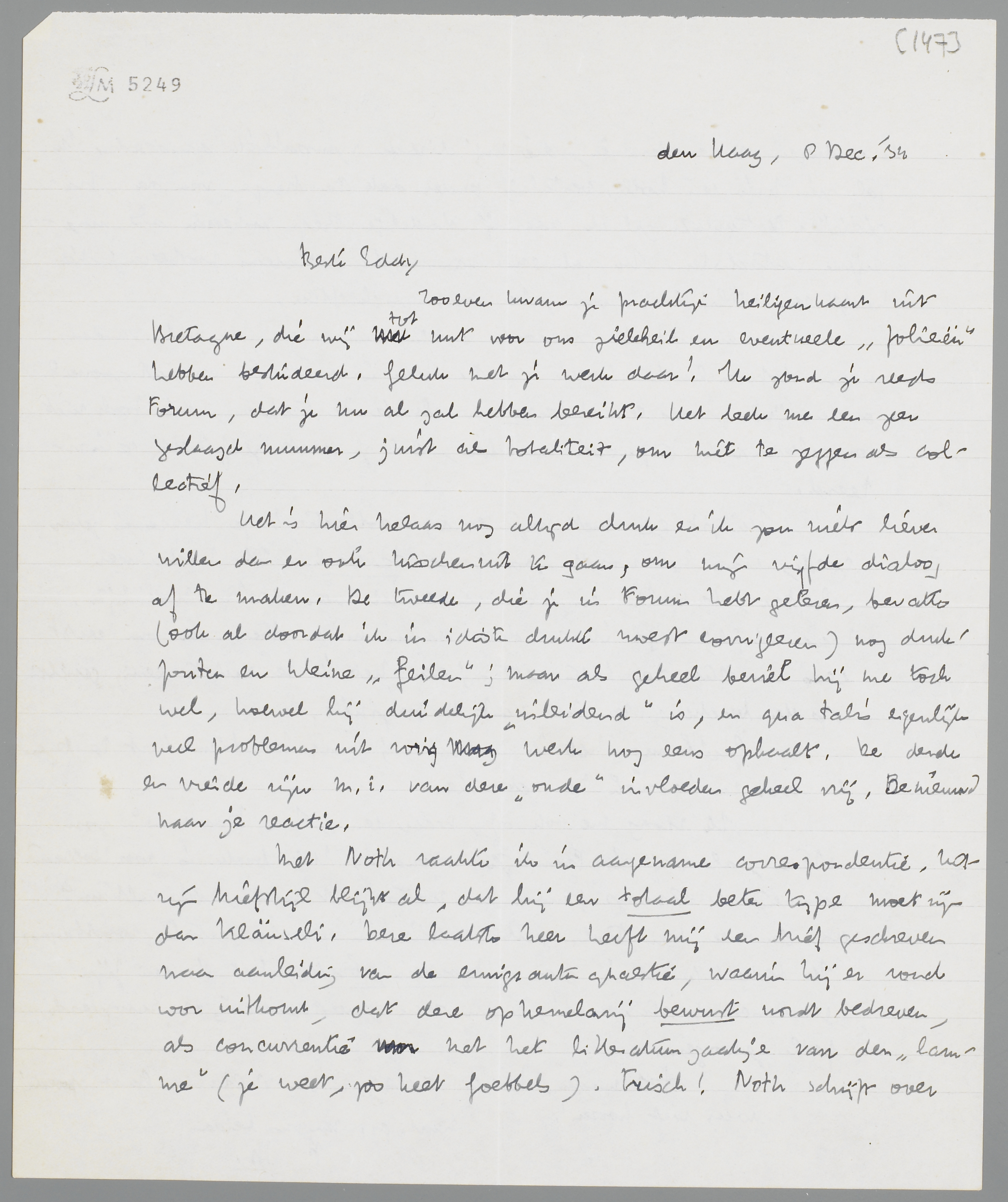 Het is hier helaas nog altijd druk en ik zou niets liever willen dan er ook tusschenuit te gaan, om mijn vijfde dialoog af te maken. De tweede, die je in Forum hebt gelezen, bevatte (ook al doordat ik in idiote drukte moest corrigeeren) nog drukfouten en kleine ‘feilen’; maar als geheel beviel hij me toch wel, hoewel hij duidelijk ‘inleidend’ is, en qua talis eigenlijk veel probleemen uit vorig werk nog eens ophaalt. De derde en vierde zijn m.i. van deze ‘oude’ invloeden geheel vrij. Benieuwd naar je reactie.