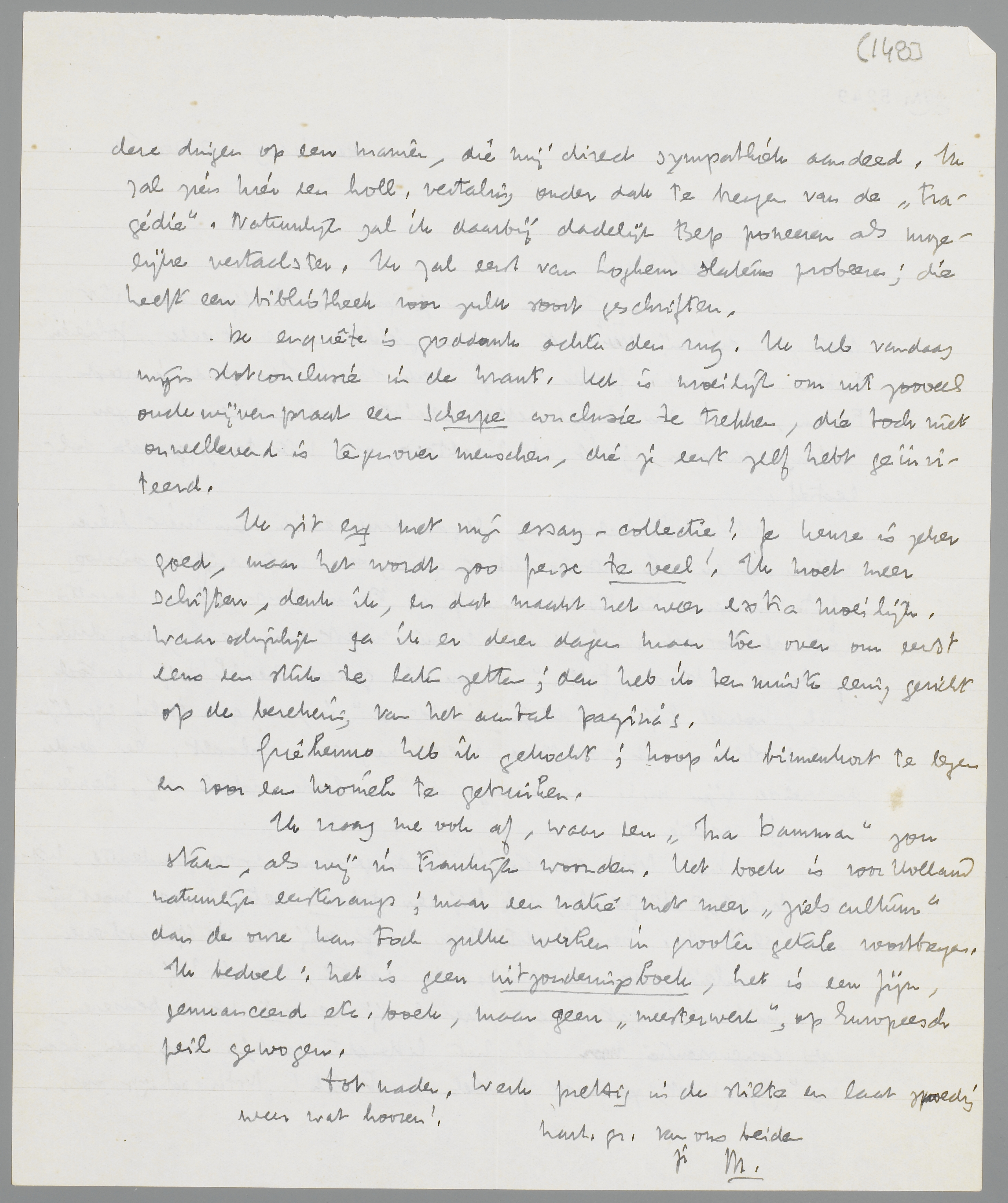 Ik vraag me ook af, waar een Ina Damman zou staan, als wij in Frankrijk woonden. Het boek is voor Holland natuurlijk eersterangs; maar een natie met meer ‘zielscultuur’ dan de onze kan toch zulke werken in grooter getale voortbrengen. Ik bedoel: het is geen uitzonderingsboek, het is een fijn, genuanceerd etc. boek, maar geen ‘meesterwerk’, op Europeesch peil gewogen. Tot nader. Werk prettig in de stilte en laat spoedig weer wat hooren! hart. gr. van ons beiden