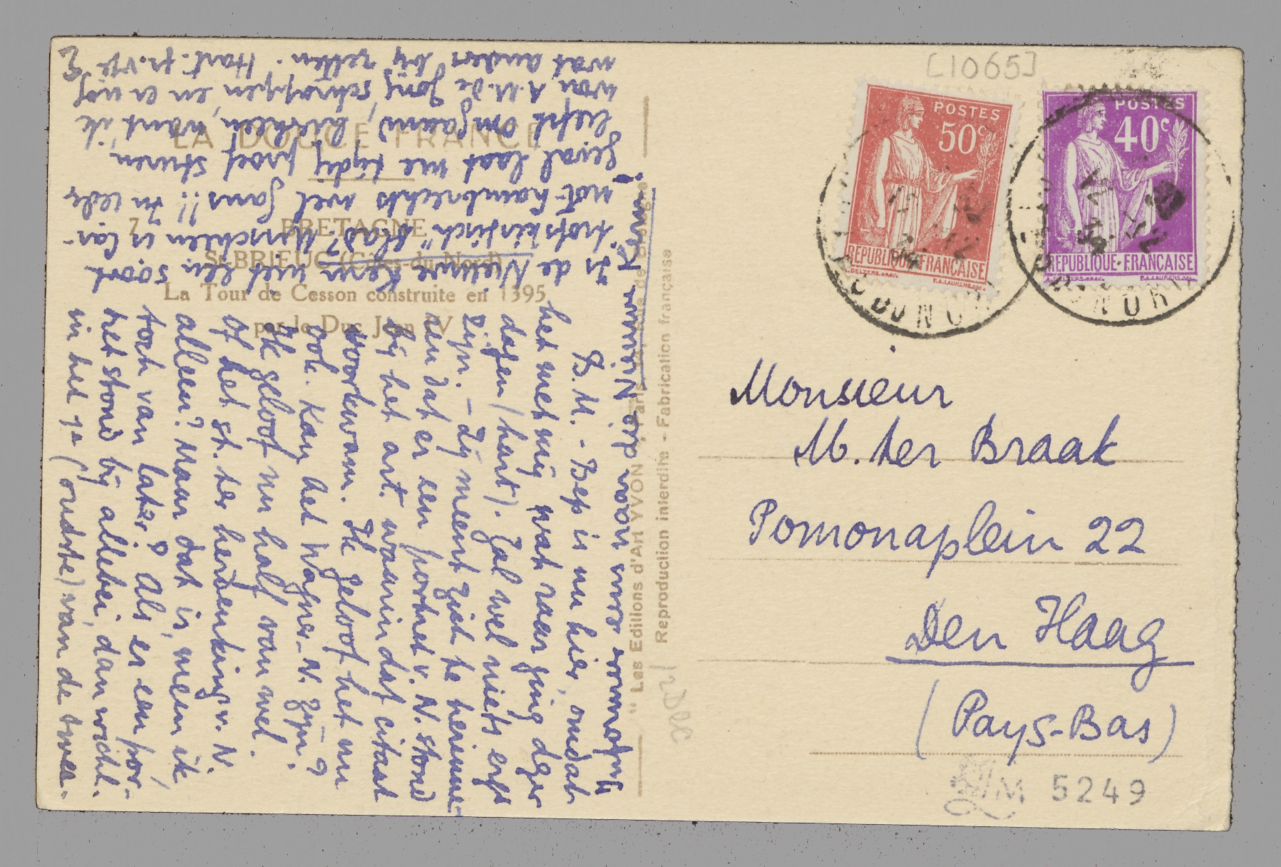 - Bep is nu hier, omdat het met mij wat raar ging dezer dagen (hart). Zal wel niets ergs zijn. - Zij meent zich te herinneren dat er een portret v.N. stond bij het art. waarin dat citaat voorkwam. Ik geloof het nu ook. Kan het Wagner-N. zijn? Ik geloof nu half van wel. Of het st. ter herdenking v.N. alleen? Maar dat is, meen ik, toch van later? Als er een portret stond bij allebei, dan wschl. in het 1e (oudste) van de twee. - Is de Nieuwe Kern niet een soort ‘trotskistisch’ blad? Misschien is Carnot-Lambrechts wel Gans! In ieder geval laat me tijdig proef sturen, liefst omgaand, hierheen, want ik wou A.M. de Jong schrappen en er nog wat anders bij zetten. Hart. gr. v. je